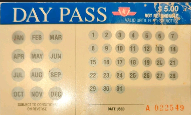 Unused vintage Toronto Transit Commission day pass. $5.00. Valid until further notice. Scratch-off calendar style. Instructions included. Collector's item.