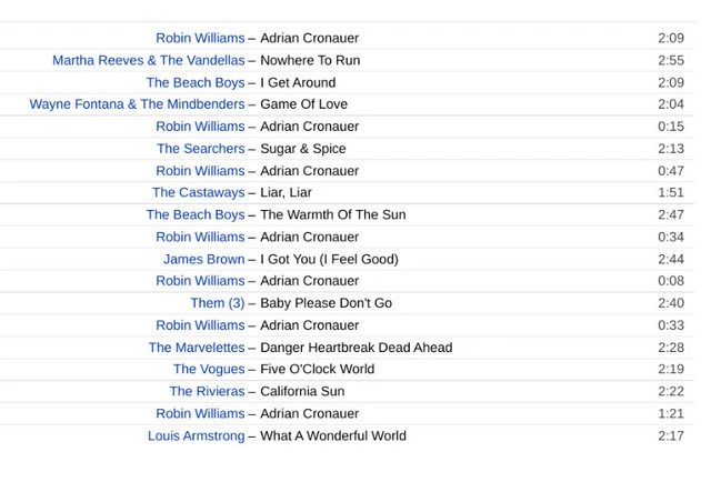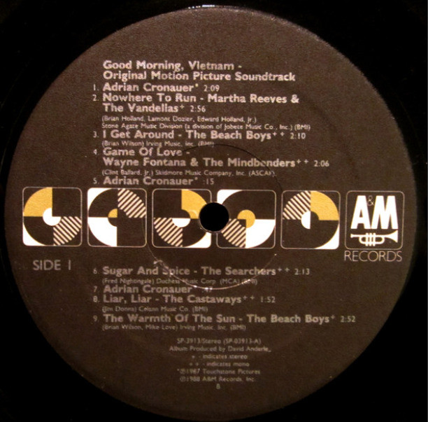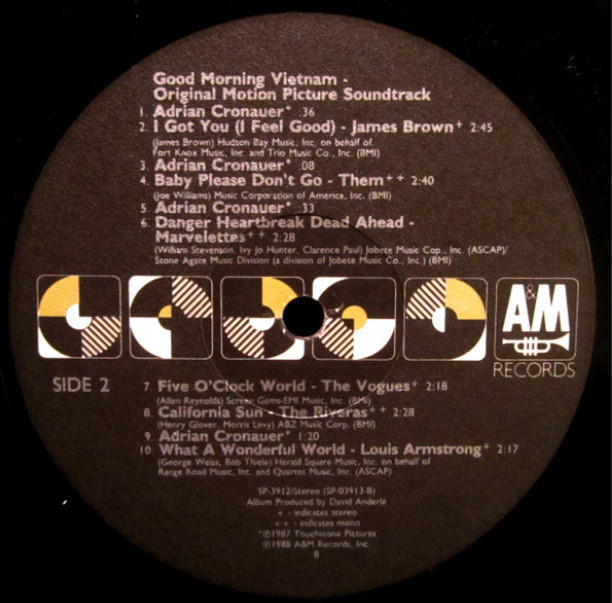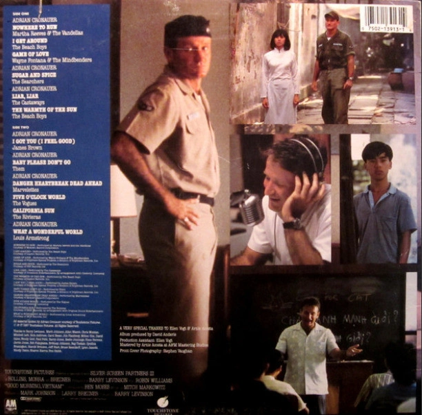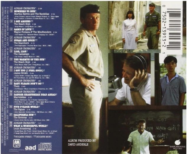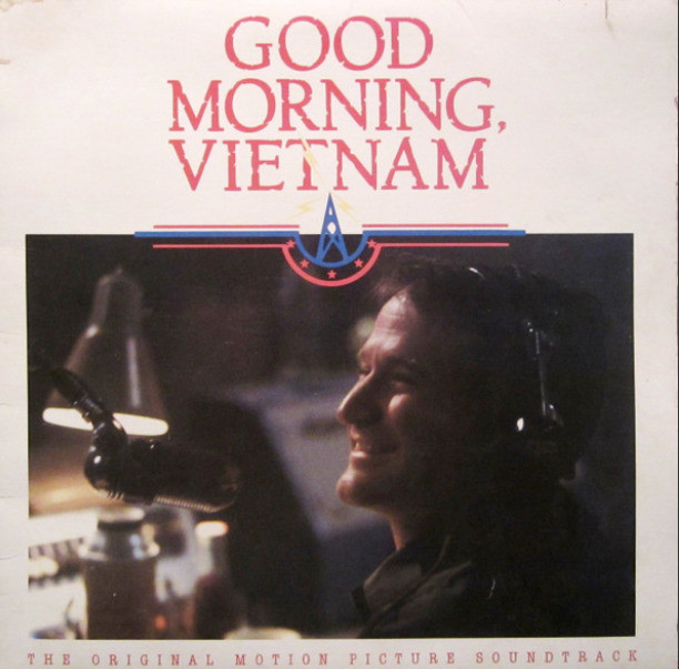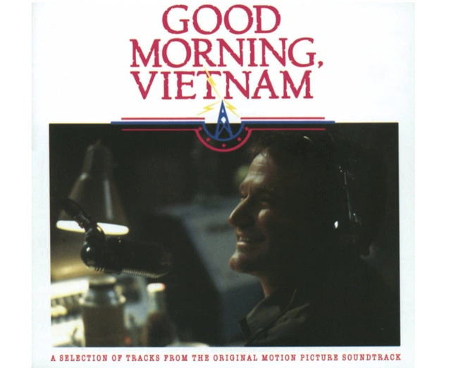 Good Morning Vietnam Various Artists CD. Includes tracks from Robin Williams, Martha Reeves & The Vandellas, The Beach Boys, Wayne Fontana & The Mindbenders, The Searchers, The Castaways, James Brown, Them, The Marvelettes, The Vogues, The Rivieras, and Louis Armstrong.