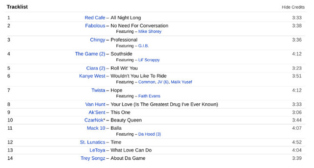 Coach Carter Music From The M Various (Artist) Format: Audio CD Various – Coach Carter Soundtrack Label: Capitol Records – TOCP-66372 Format: CD, Compilation, Copy Protected Country: Japan Released: 2005 Genre: Hip Hop, Stage & Screen Style: Soundtrack,, Pop Rap 1 Red Cafe– All Night Long 3:33 2 Fabolous– No Need For Conversation Featuring – Mike Shorey 3:38 3 Chingy– Professional Featuring – G.I.B. 3:36 4 The Game (2)– Southside Featuring – Lil' Scrappy 4:12 5 Ciara (2)– Roll Wit' You 3:23 6 Kanye West– Wouldn't You Like To Ride Featuring – Common, JV (6), Malik Yusef 3:51 7 Twista– Hope Featuring – Faith Evans 4:12 8 Van Hunt– Your Love (Is The Greatest Drug I've Ever Known) 3:33 9 Ak'Sent– This One 3:06 10 CzarNok*– Beauty Queen 3:44 11 Mack 10– Balla Featuring – Da Hood (3) 4:07 12 St. Lunatics– Time 4:52 13 LeToya– What Love Can Do 4:04 14 Trey Songz– About Da Game 3:39