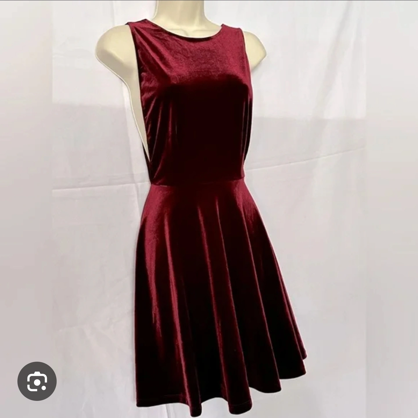 This is a burgundy velvet dress. It is sleeveless and has a round neckline. The dress has a fit and flare silhouette. It is in great condition and ready for a new home