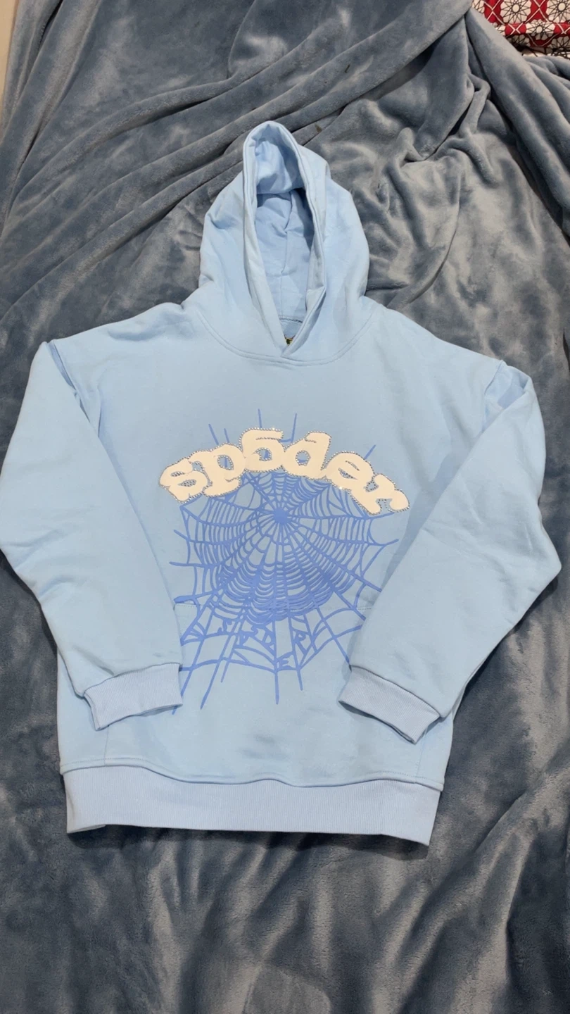 25Selling a brand new never worn light blue Sp5der hoodie It's in great condition and ready for a new home. The logo is white with rhinestones around it. Which shine with flash in dark price is negotiable a bit size small fits like medium