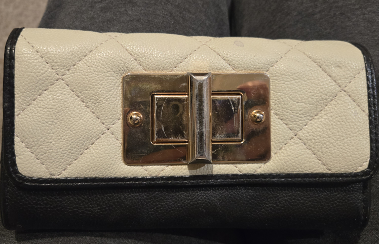 Selling a two-tone wallet in good condition. It features a quilted design on the top portion and a black bottom. Inside, there's plenty of space for cards and cash.