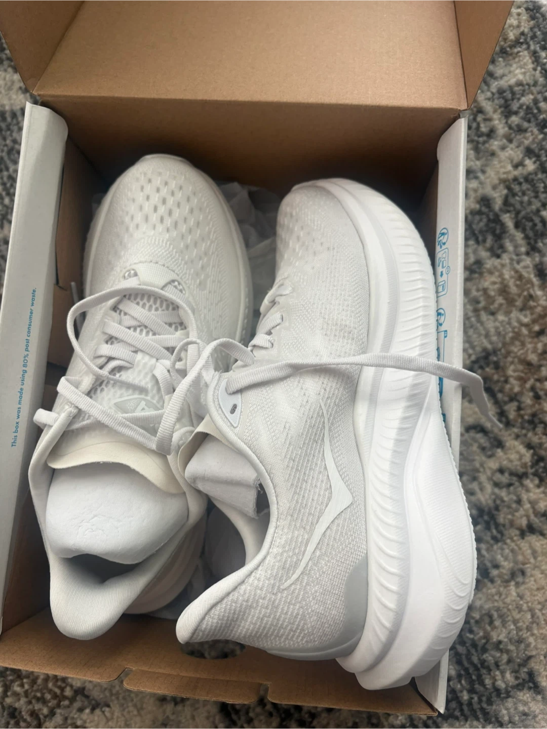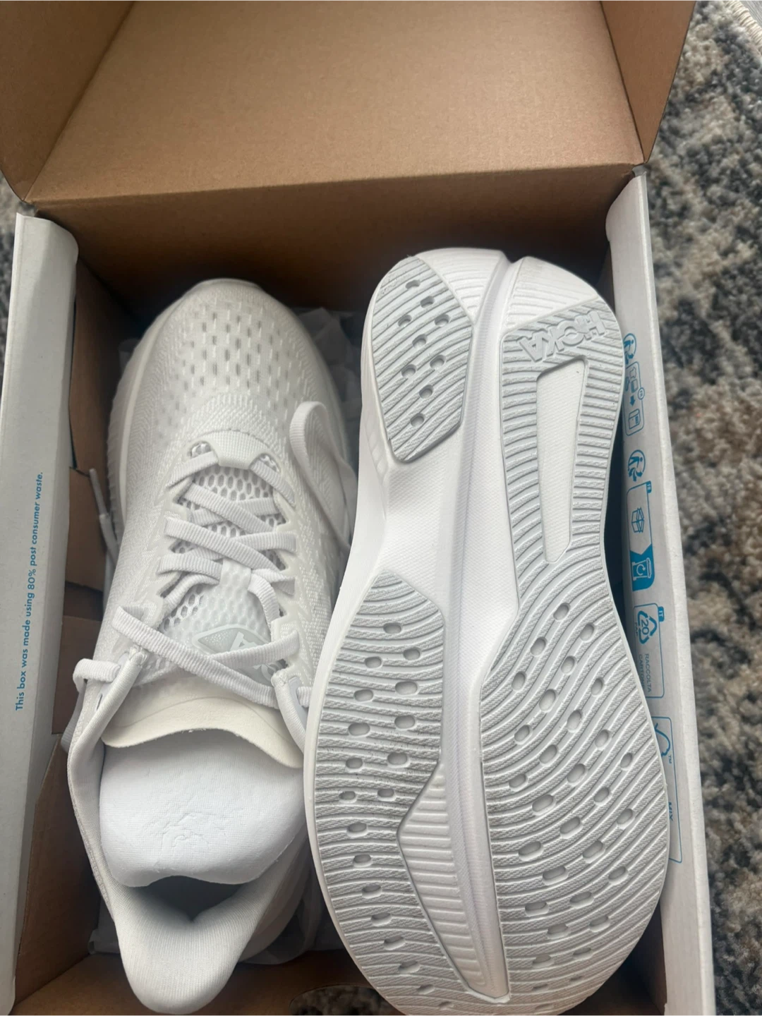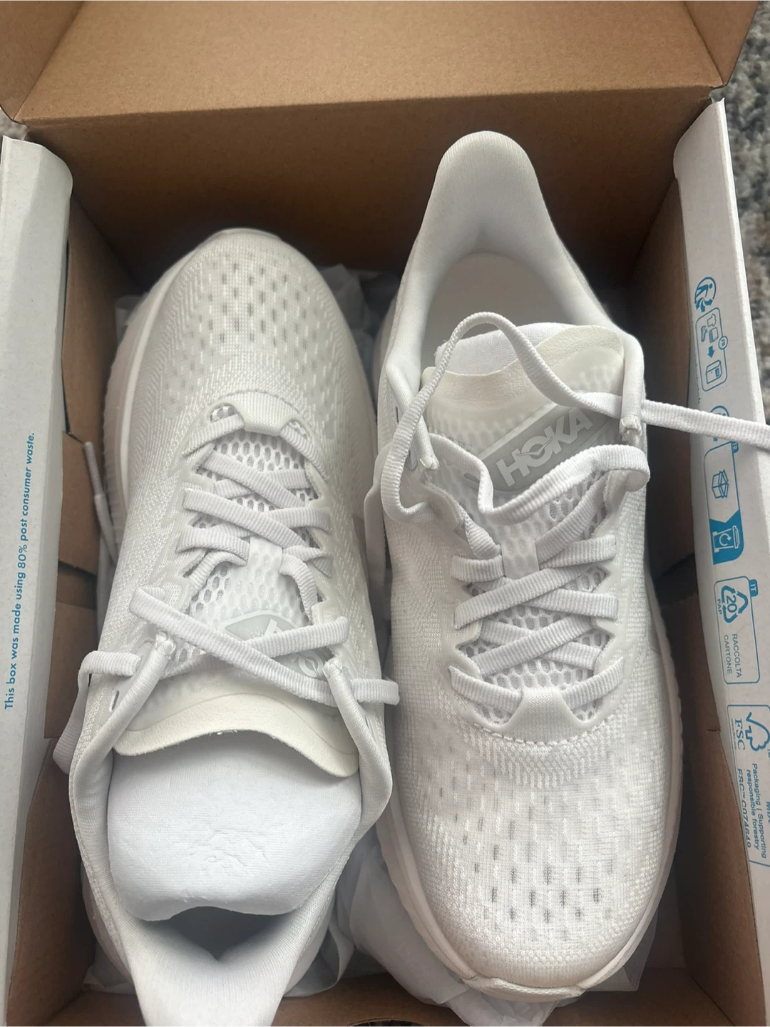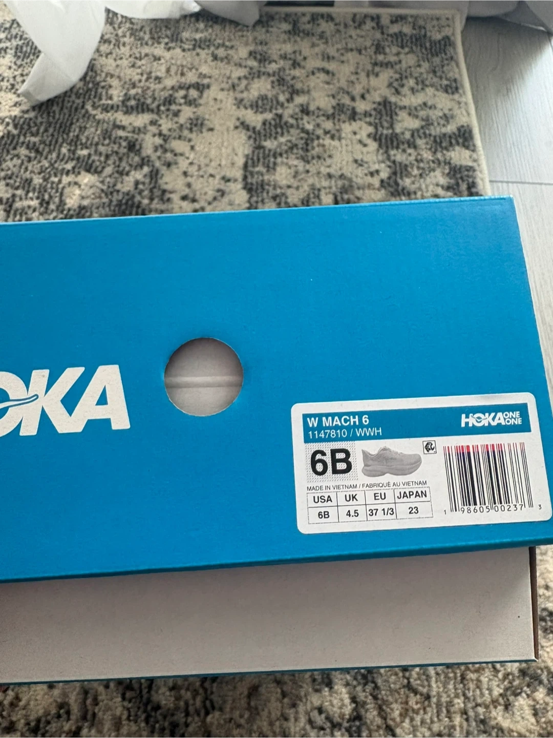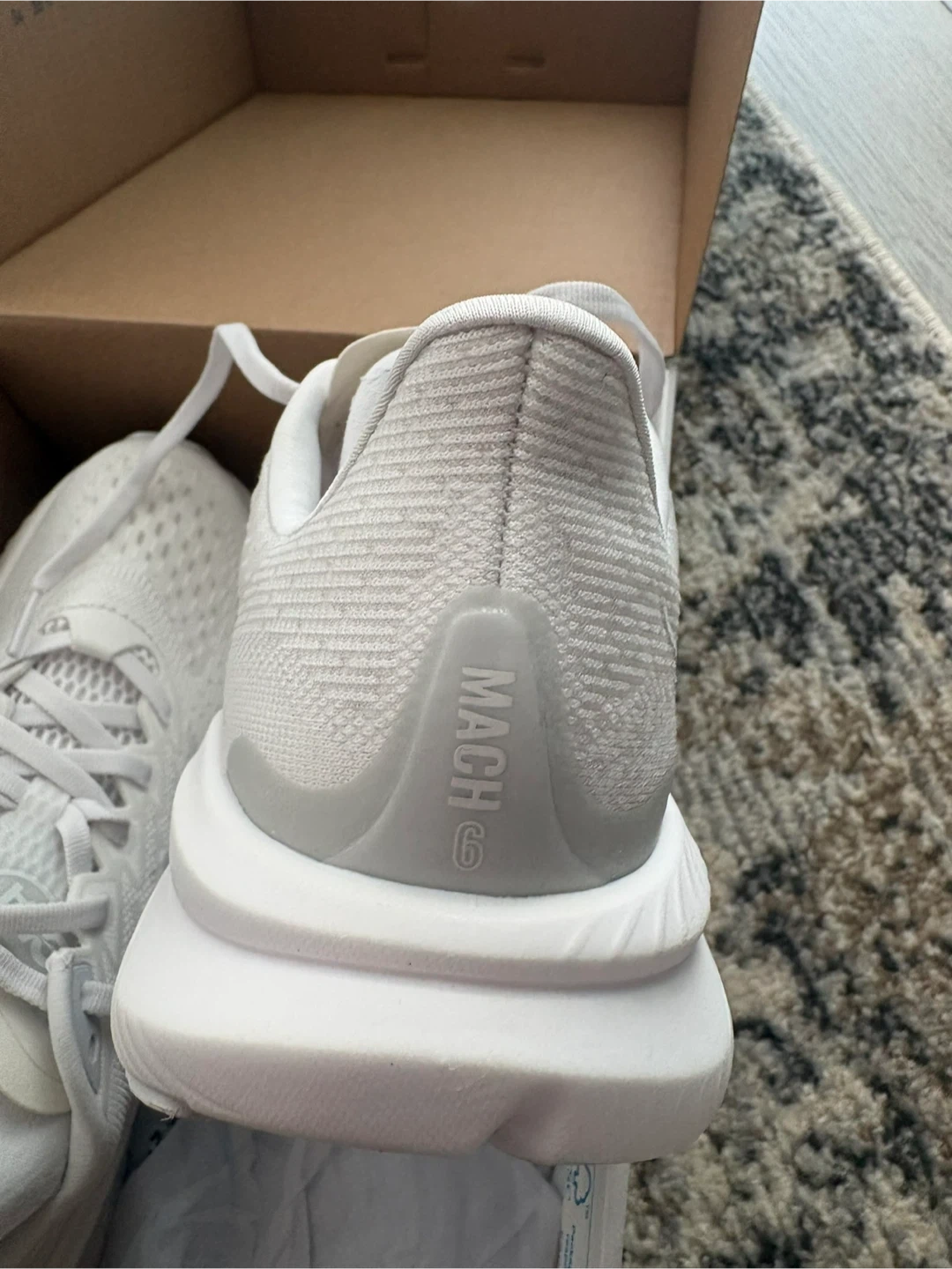 Selling a brand new pair of Hoka Mach 6 running shoes in white, women's size 6B. They come with the original box! Never worn. Runs small. $120 OBO.