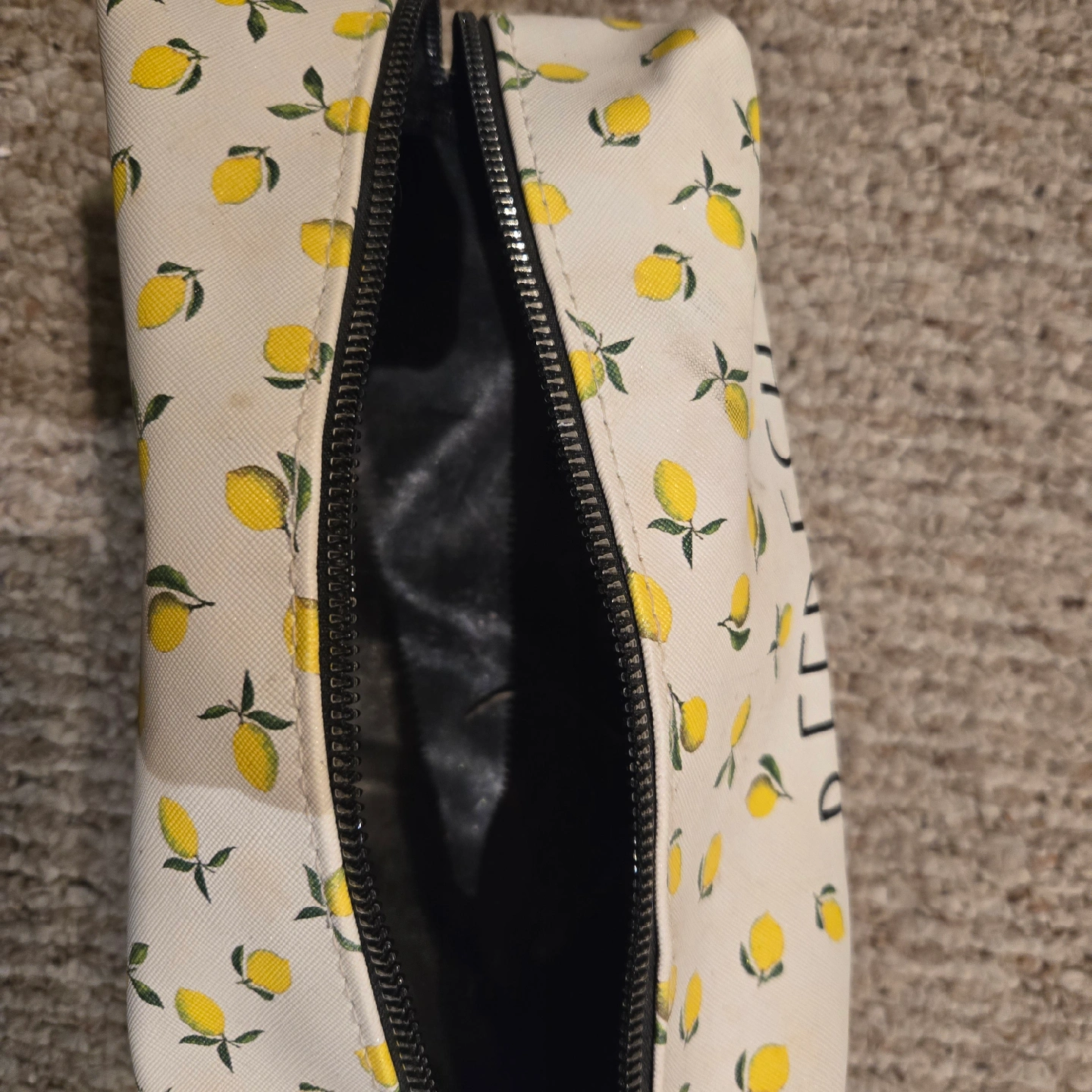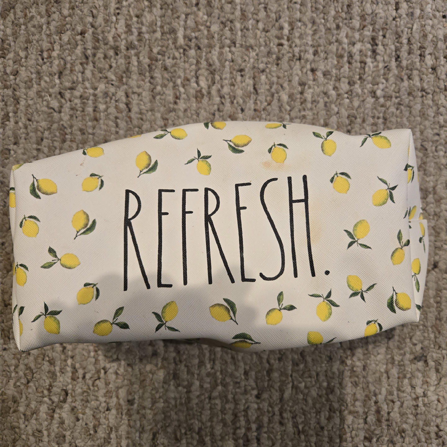 Cute Rae Dunn cosmetic bag with a lemon print and the word "REFRESH" printed on the side. It's in good condition and perfect for storing your makeup or toiletries! There is just some makeup residue inside