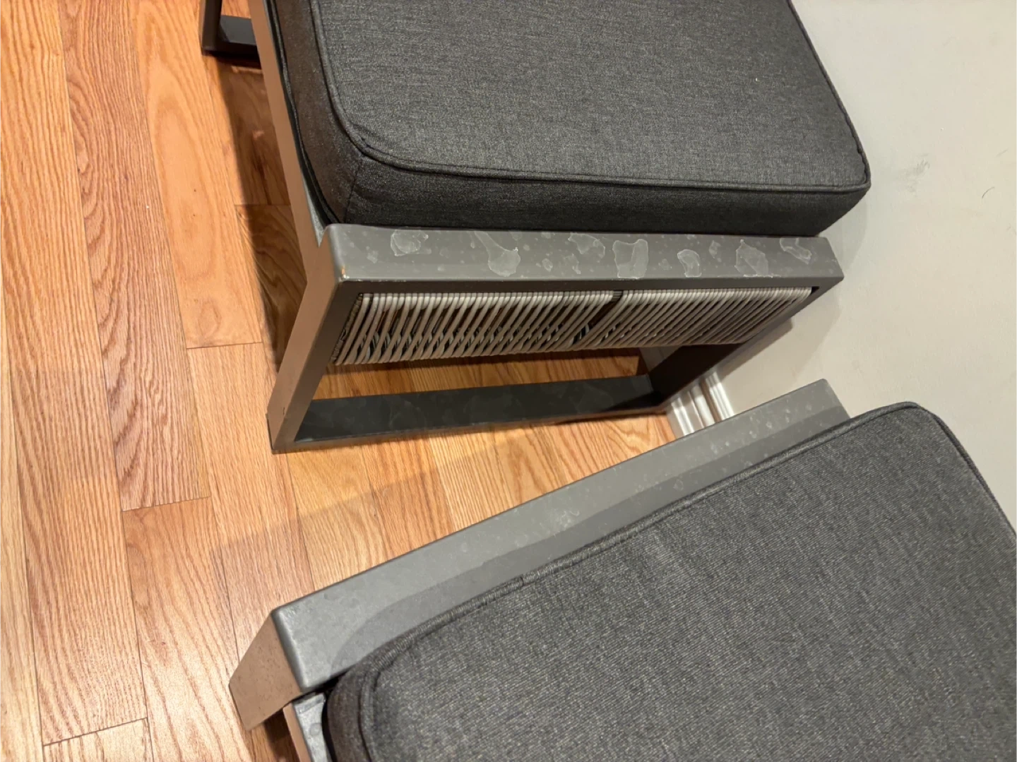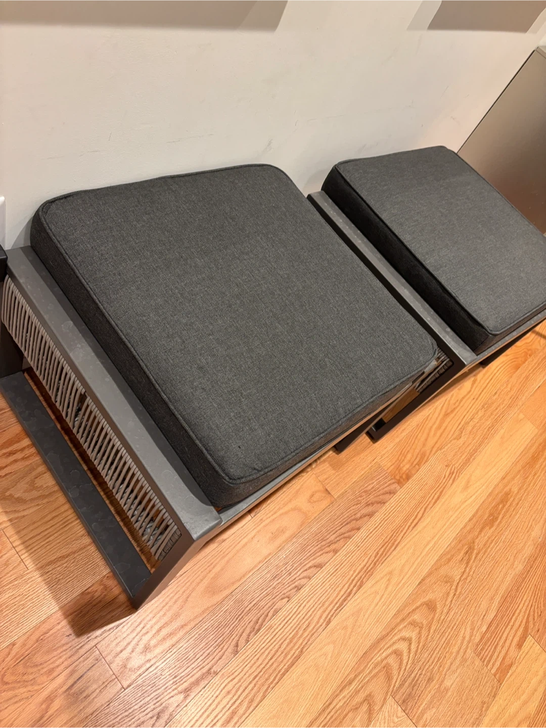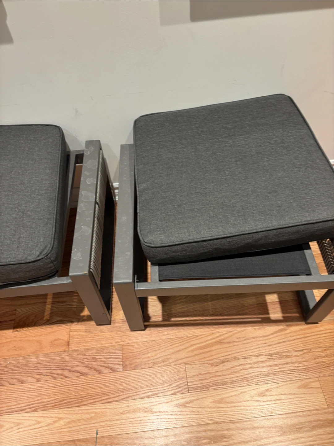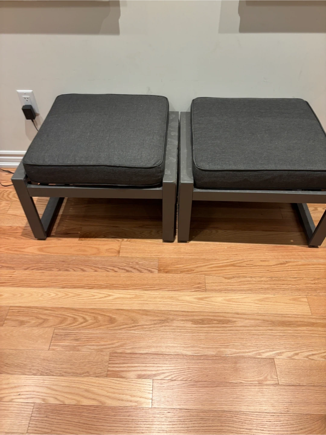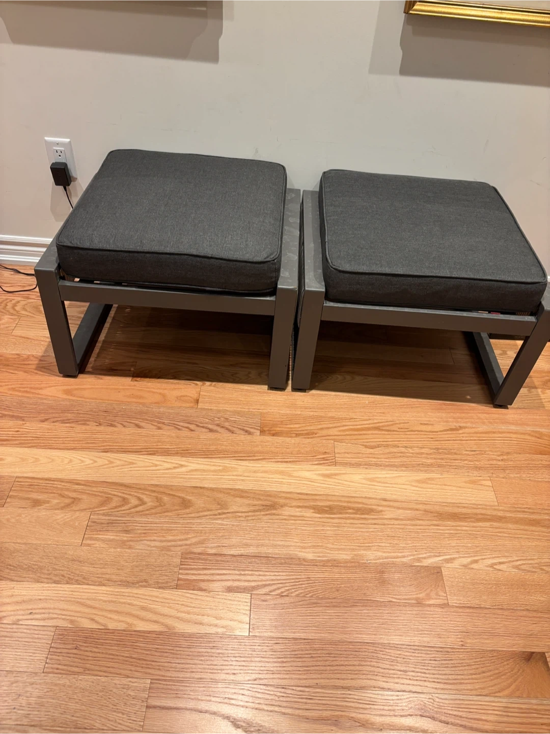 Selling a set of two outdoor patio ottomans. They feature a modern design with gray cushions and a sturdy frame. Perfect for adding extra seating and comfort to your outdoor space. Available for delivery and pickup. Set of 2