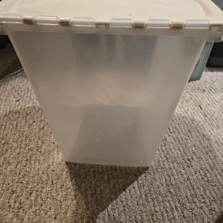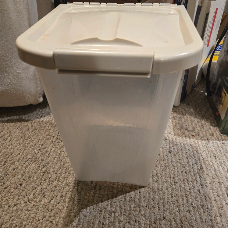 Selling a 10L plastic storage container. It's in good condition and ready to use for storing pet food, laundry detergent, or anything else you need to keep organized