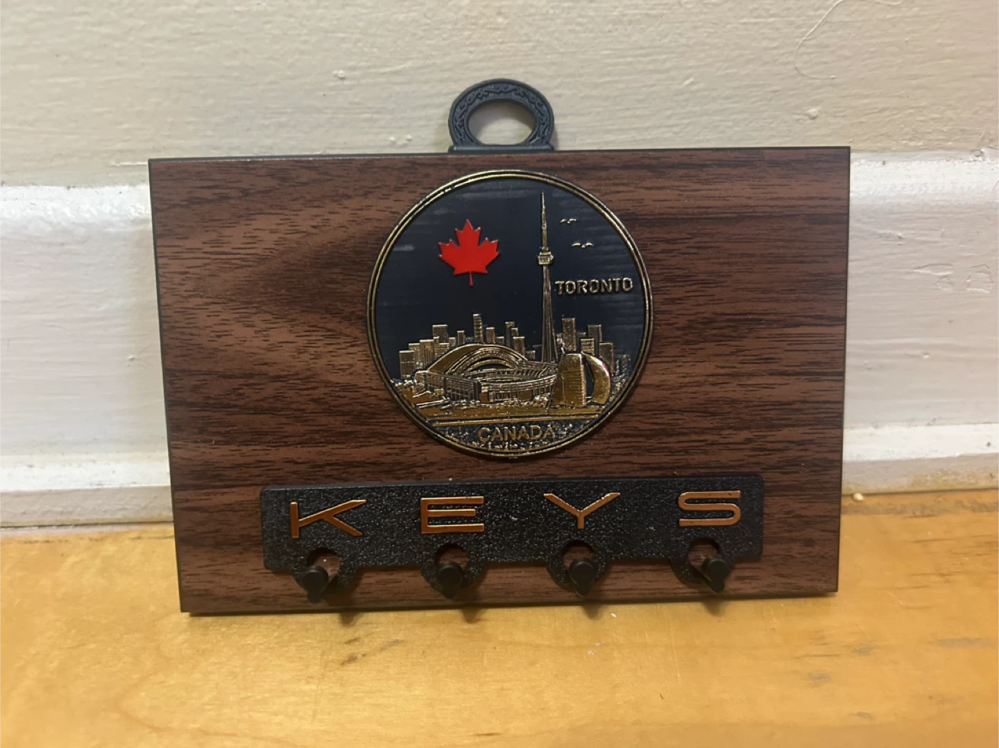 a souvenir key holder from Toronto, Canada! It features the CN Tower and a maple leaf design.