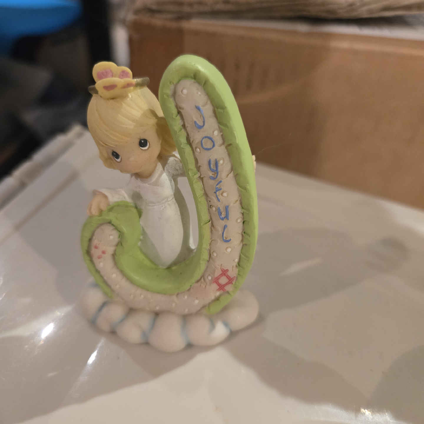 This is a Precious Moments figurine with the word 'Joyful' on it. It features a little angel with a butterfly on its head, sitting on a cloud. It's a sweet little piece for any collector or as a decorative item!
