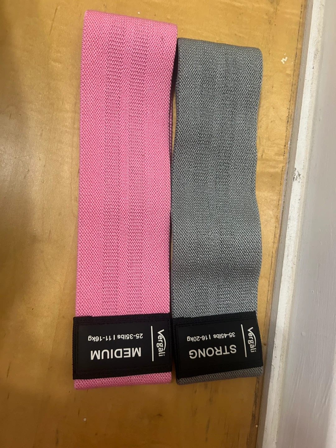 Selling a pair of Vergali resistance bands! One is medium (pink) and the other is strong (grey). Great for home workouts or taking to the gym.
