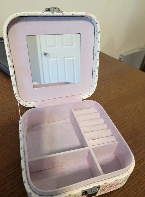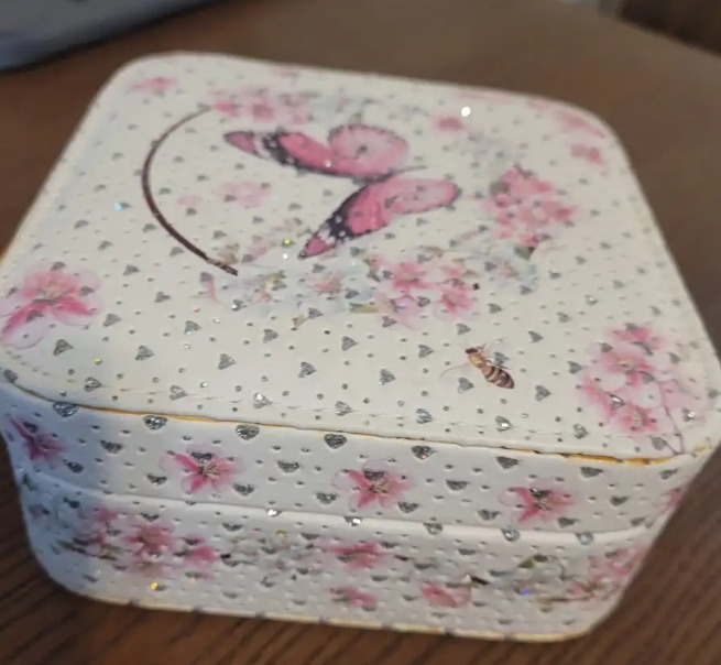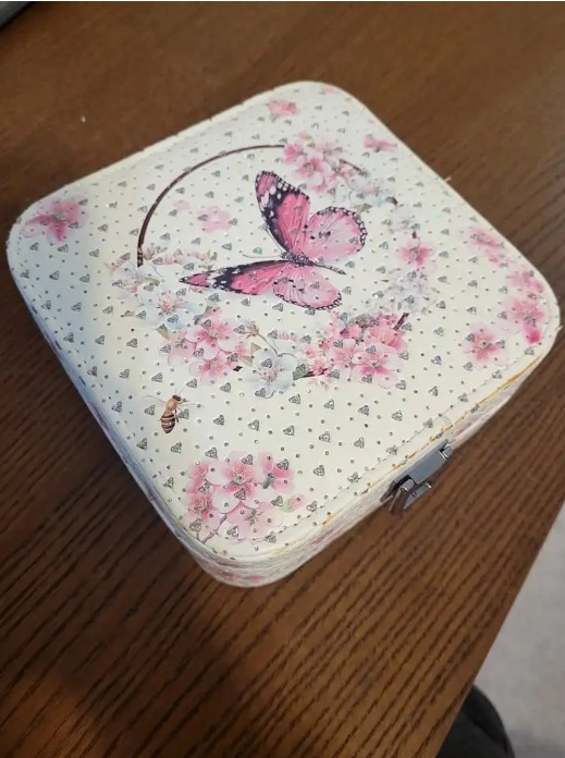 Cute jewelry box with a butterfly and floral design! It has a mirror inside and compartments for organizing your rings, necklaces, and other small treasures.