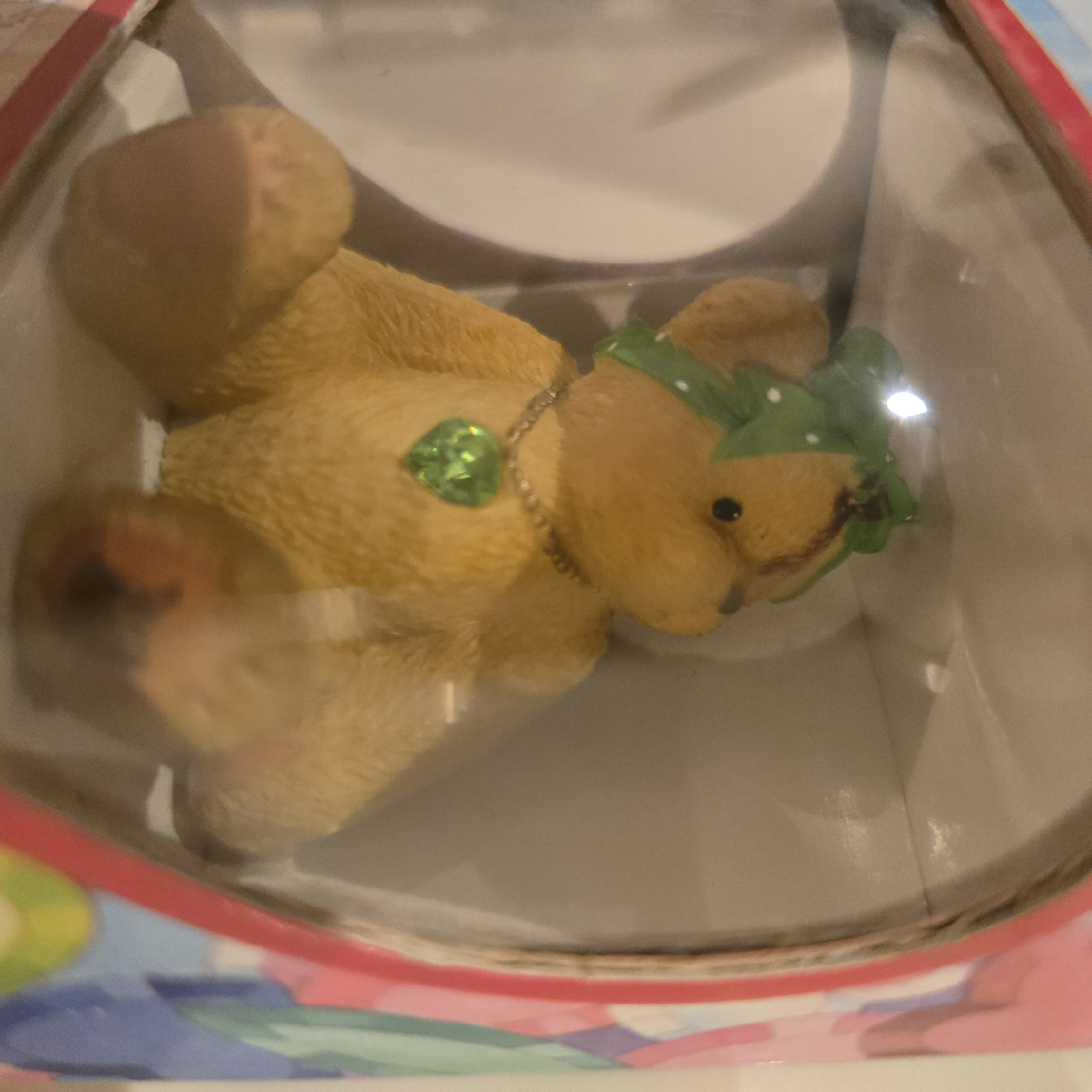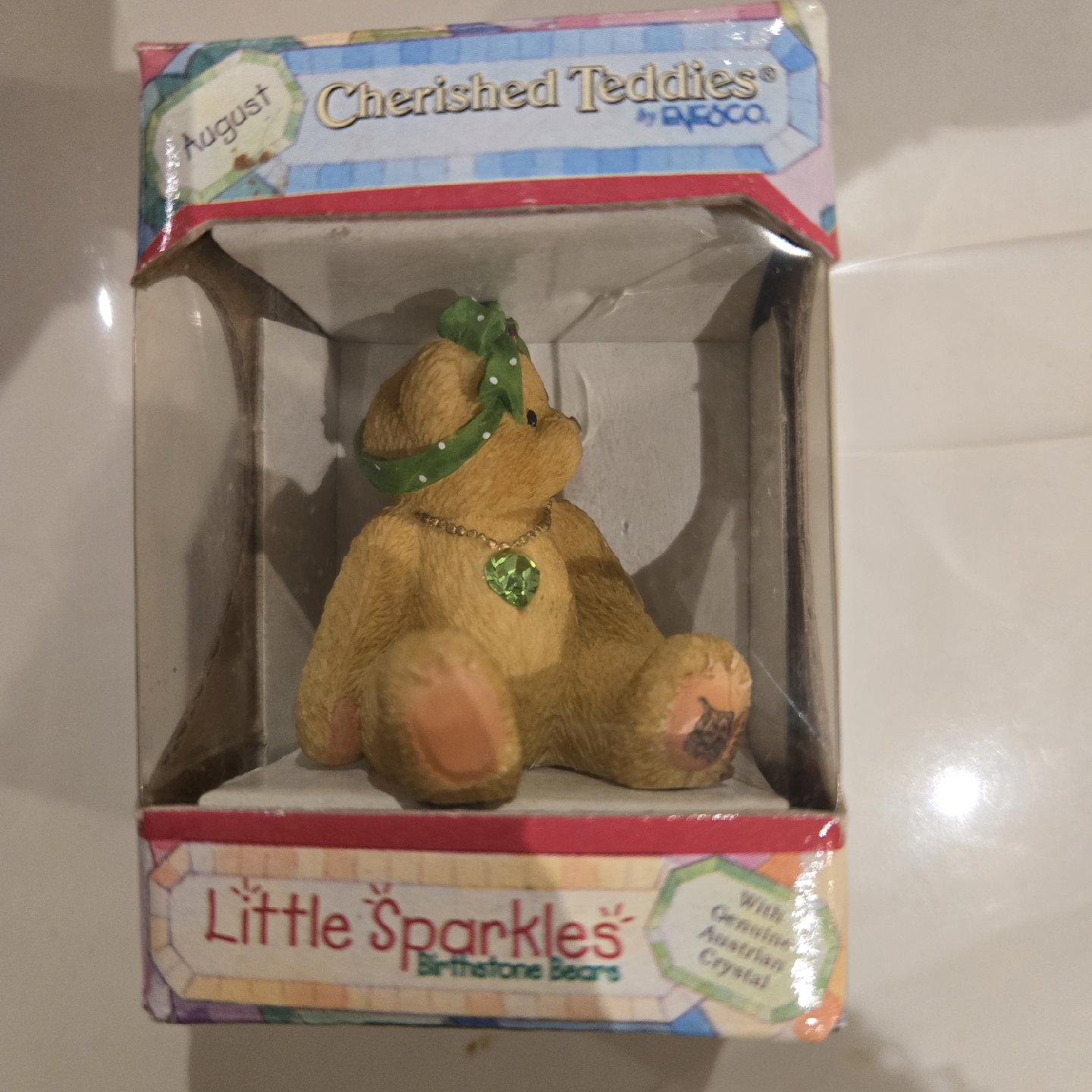 This is a Cherished Teddies figurine from Enesco, part of the "Little Sparkles Birthstone Bears" series. It represents the month of August. The teddy bear has a green headband and a heart-shaped Austrian crystal. Comes in its original box!