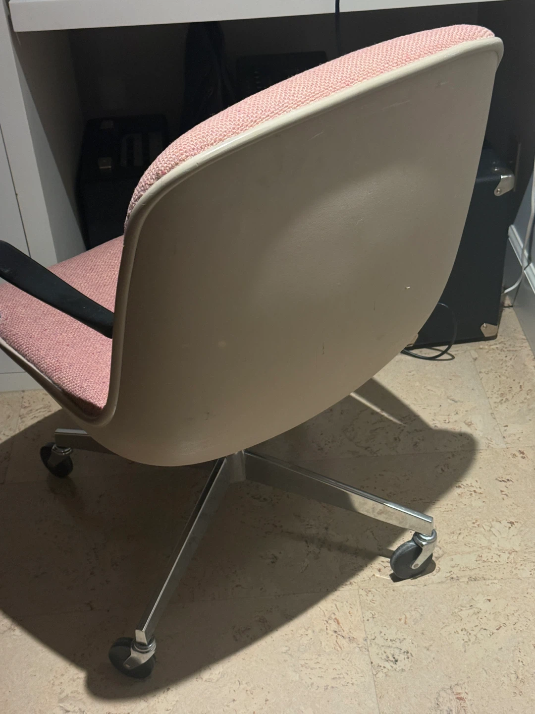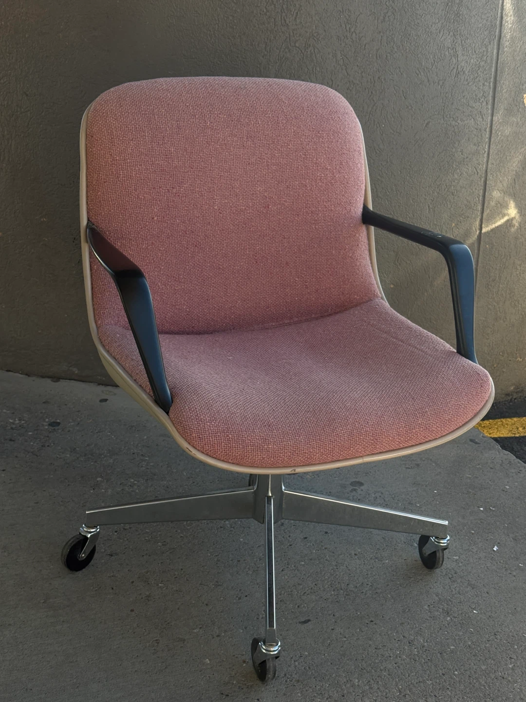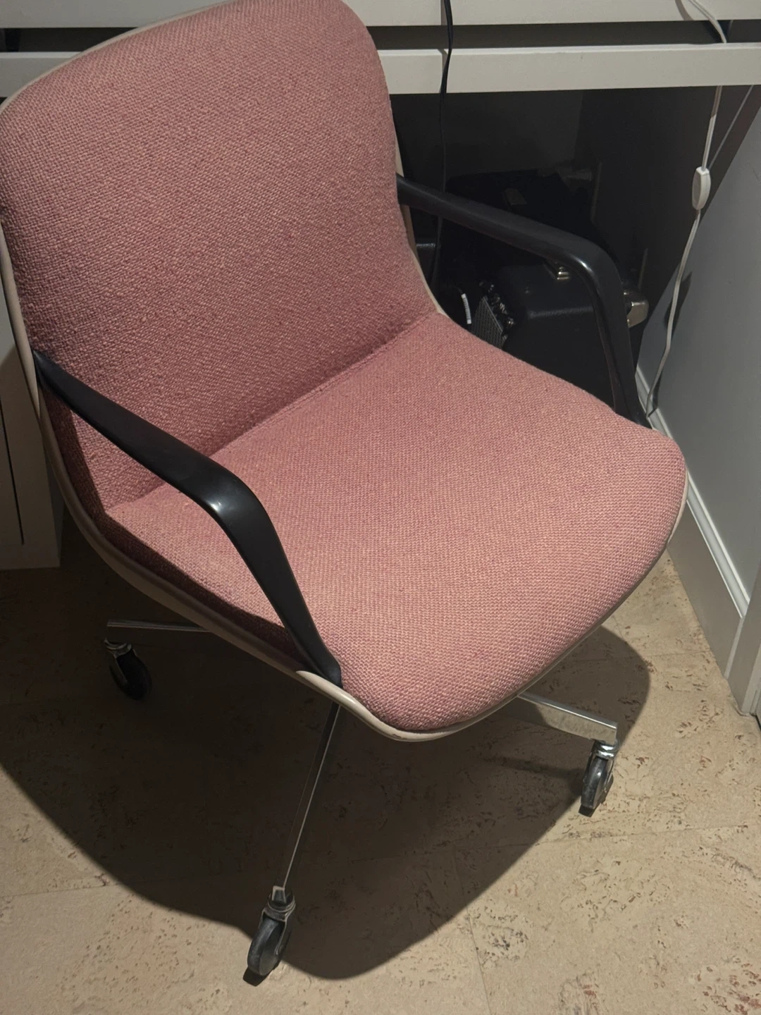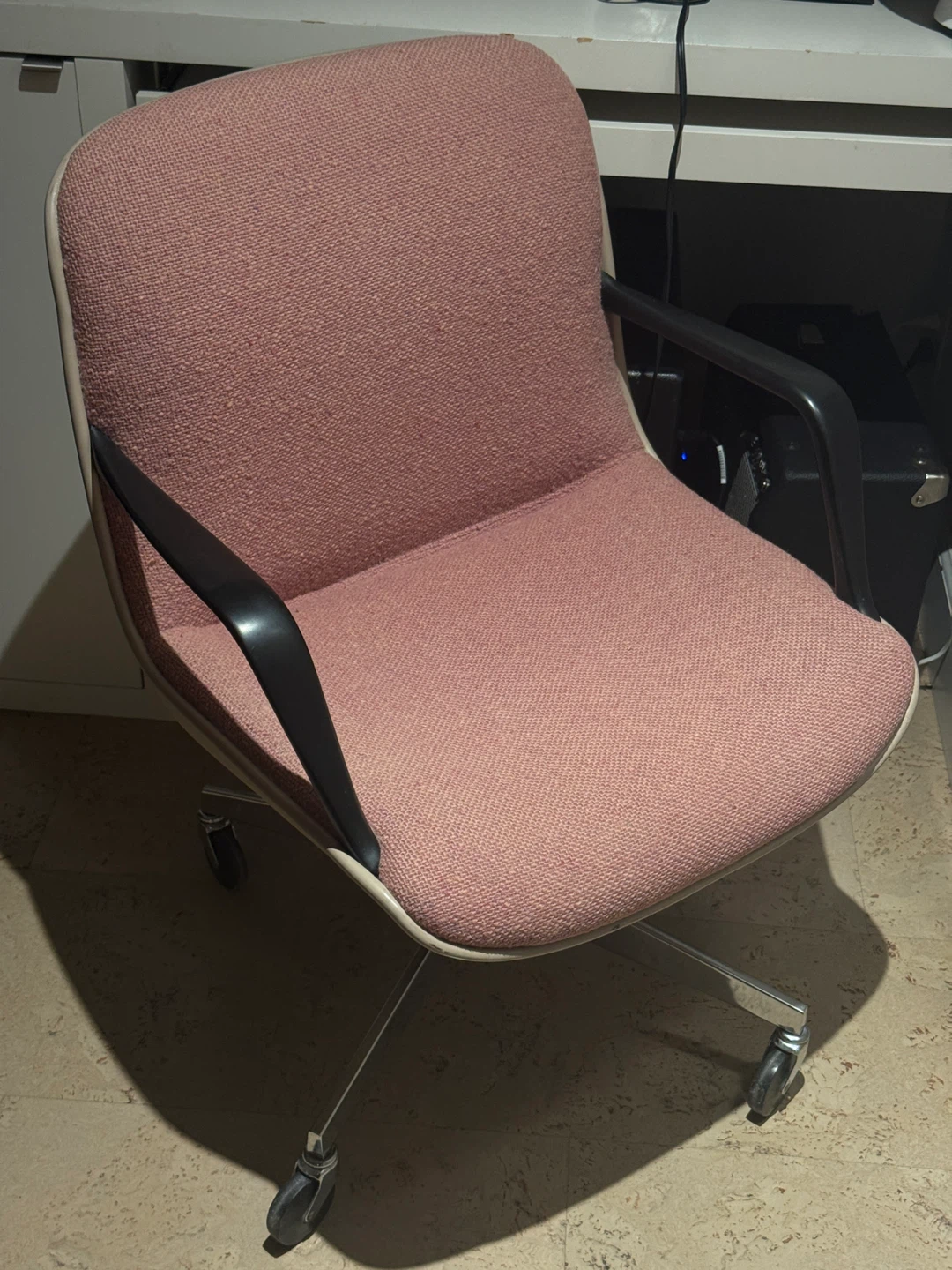 250 each or best offer. Elevate your workspace with this comfortable and stylish Steelcase office chair. This chair features a sturdy five-wheel steel chromed base, a sleek beige shell, and black armrests, complemented by a unique salmon pink fabric. It’s been well-maintained and is ready to provide excellent support and comfort for your daily tasks.
