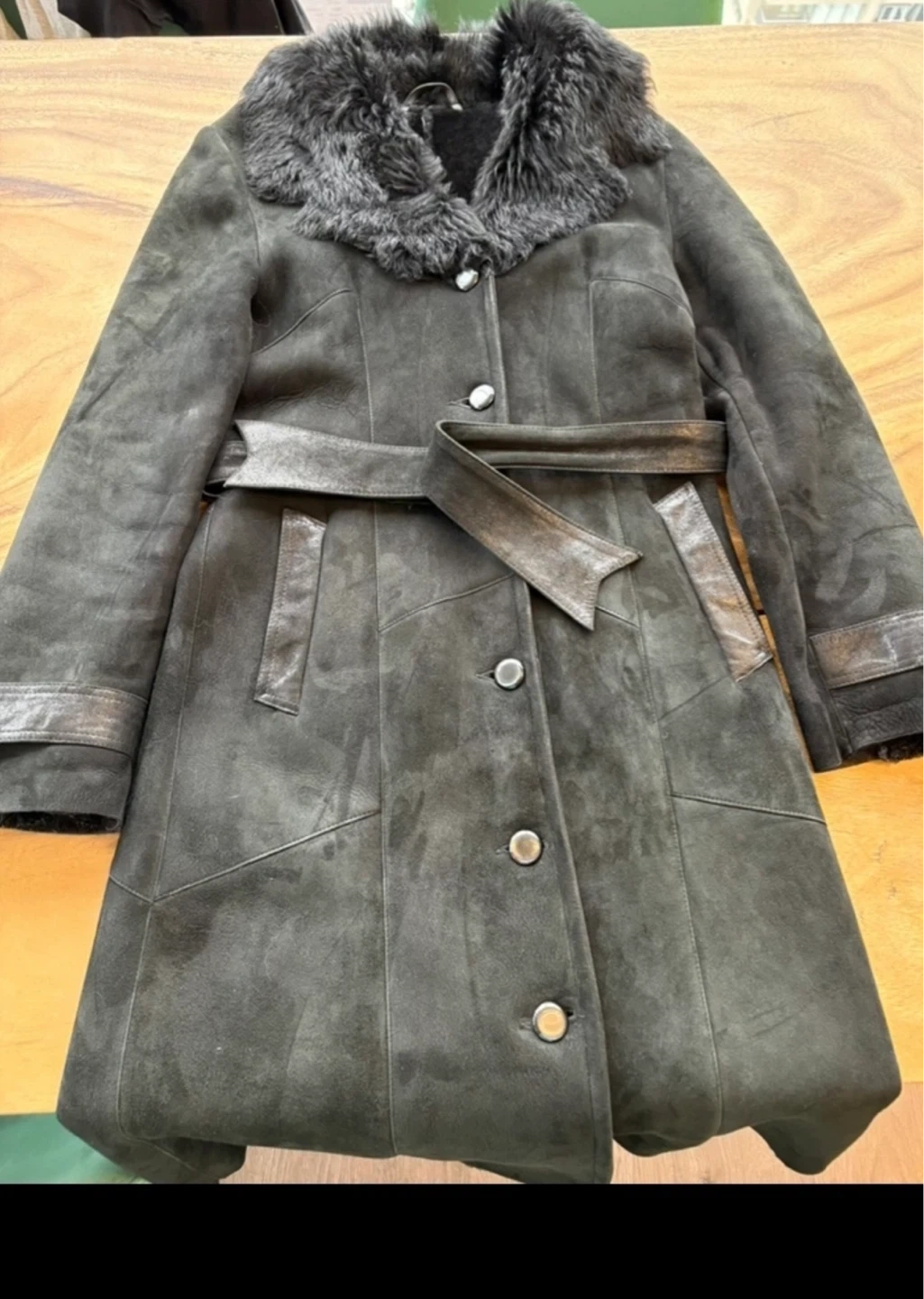 Selling a stylish shearling coat with a fur collar! It features a belted waist and button-up closure. Perfect for staying warm and fashionable during the colder months