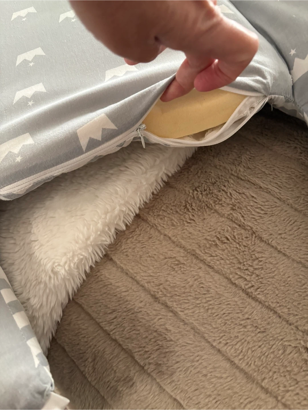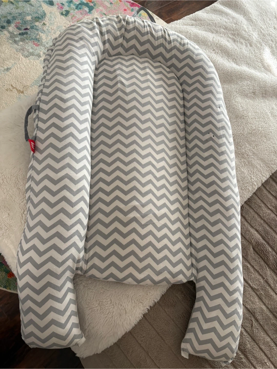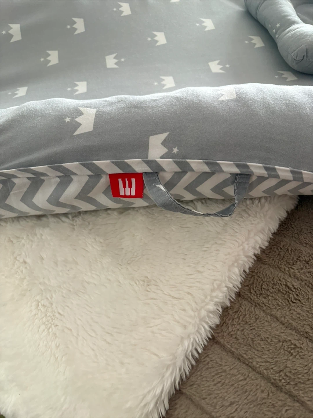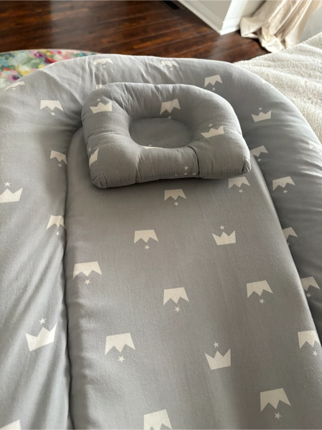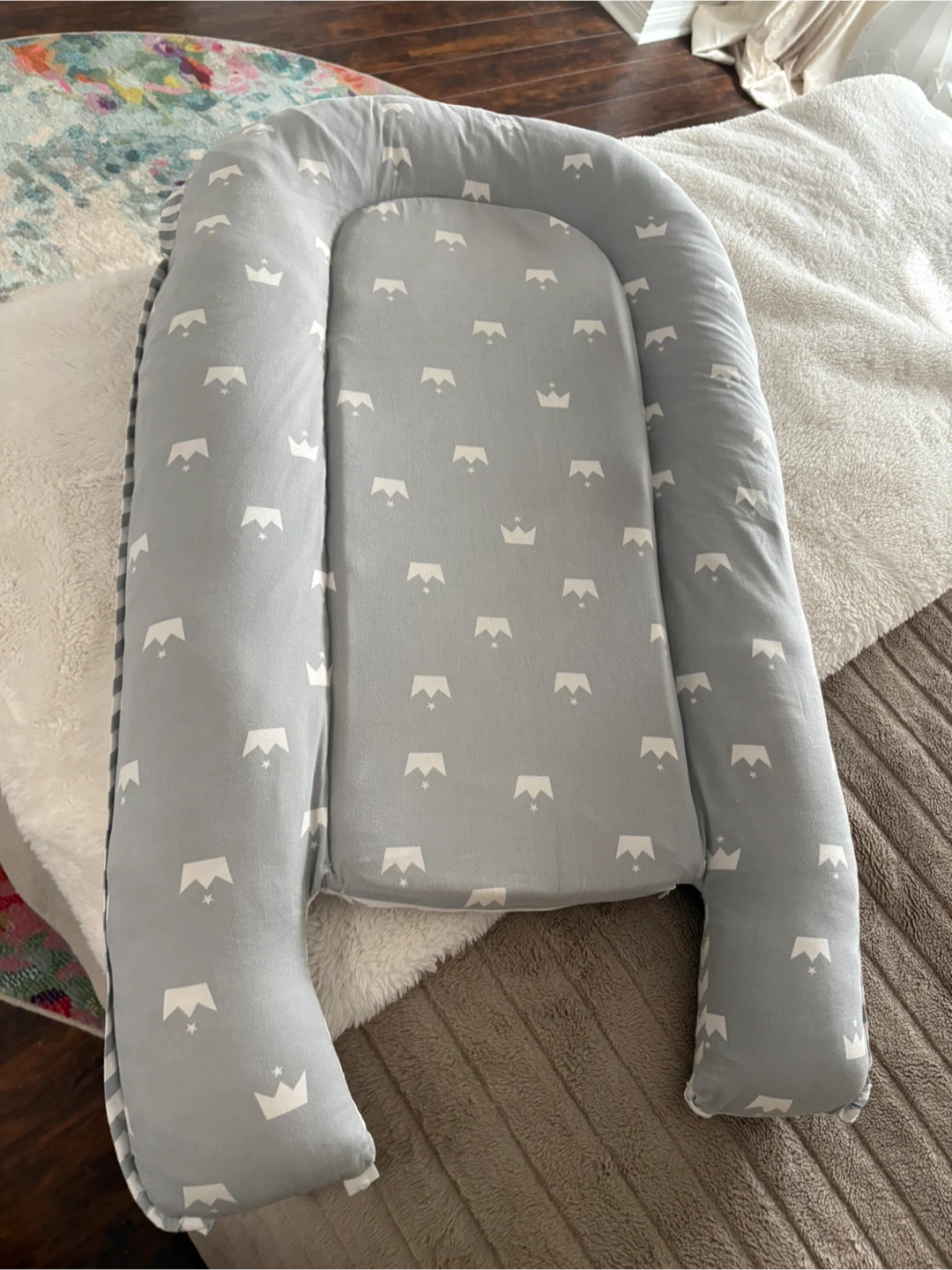 Selling a baby lounger in good condition! It features a cute grey and white crown pattern. Perfect for your little one to relax and play in a safe and comfortable space. It also comes with a removable pillow!