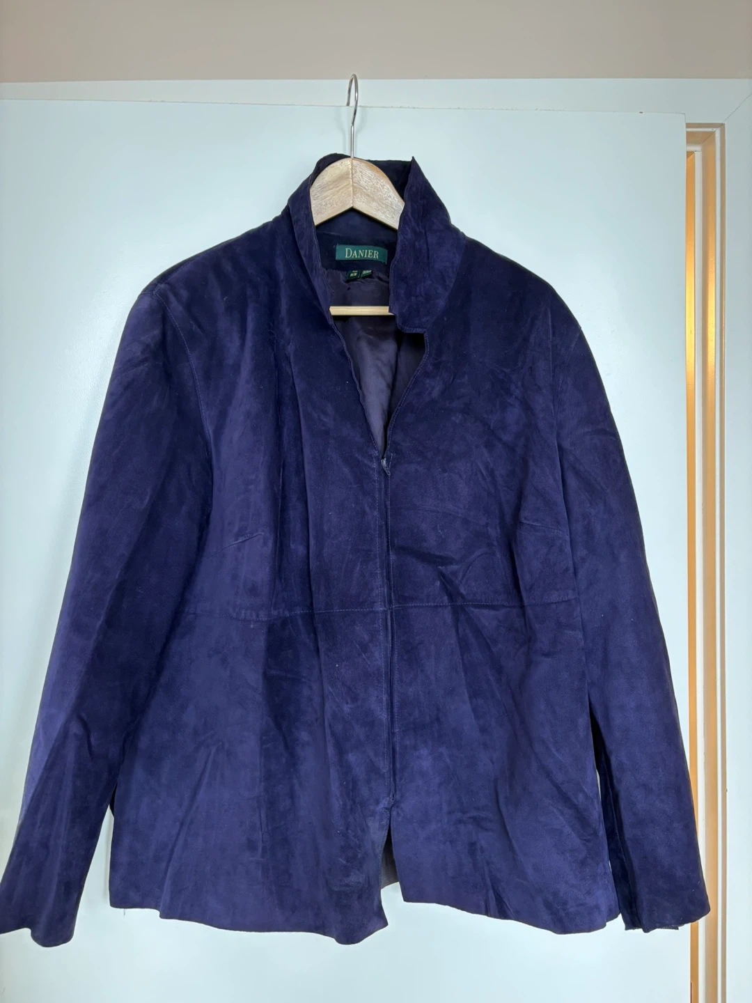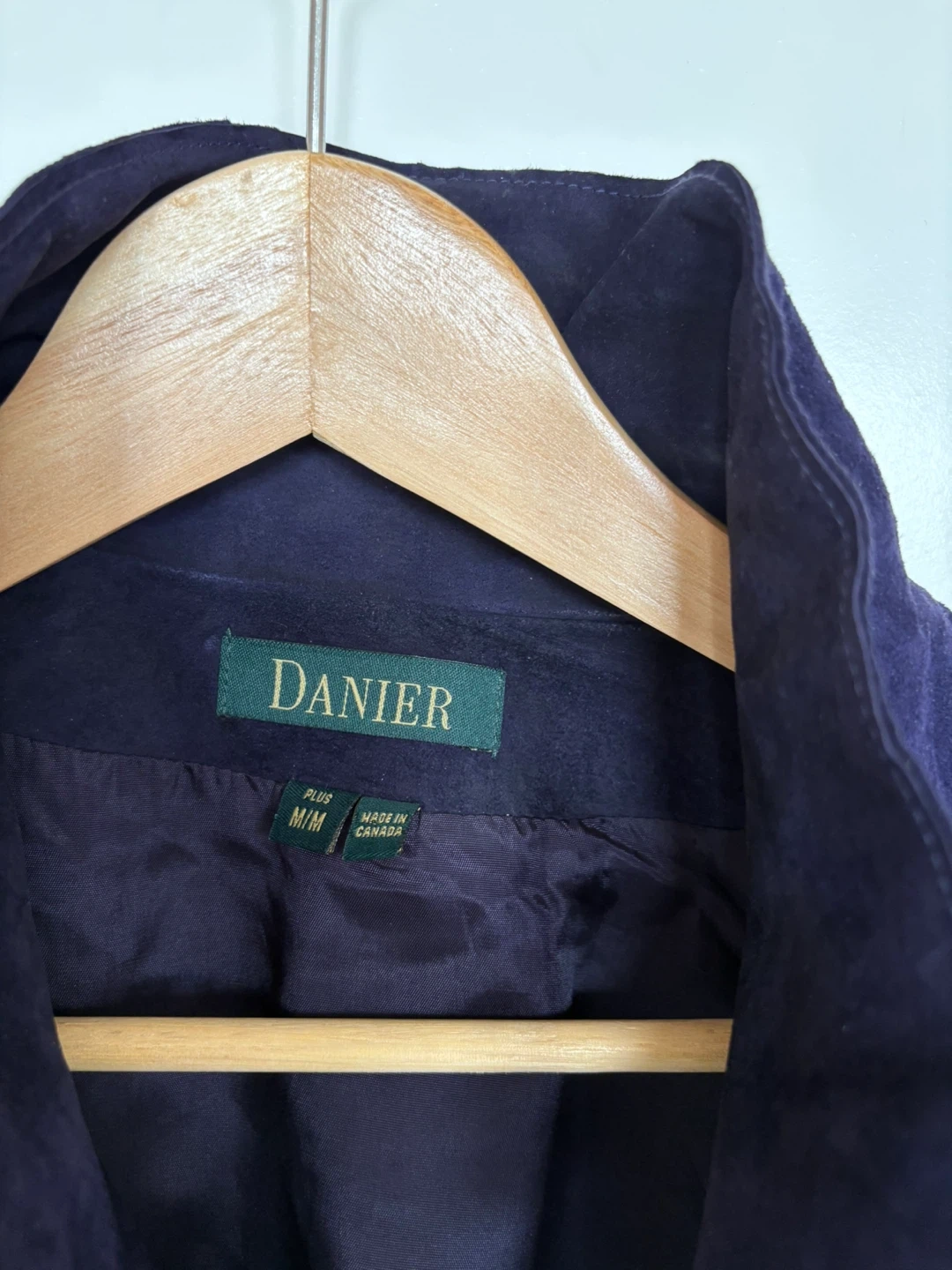Here's a lovely Danier suede jacket in a rich navy colour! It's a size M/M, made in Canada, and perfect for adding a touch of elegance to your wardrobe