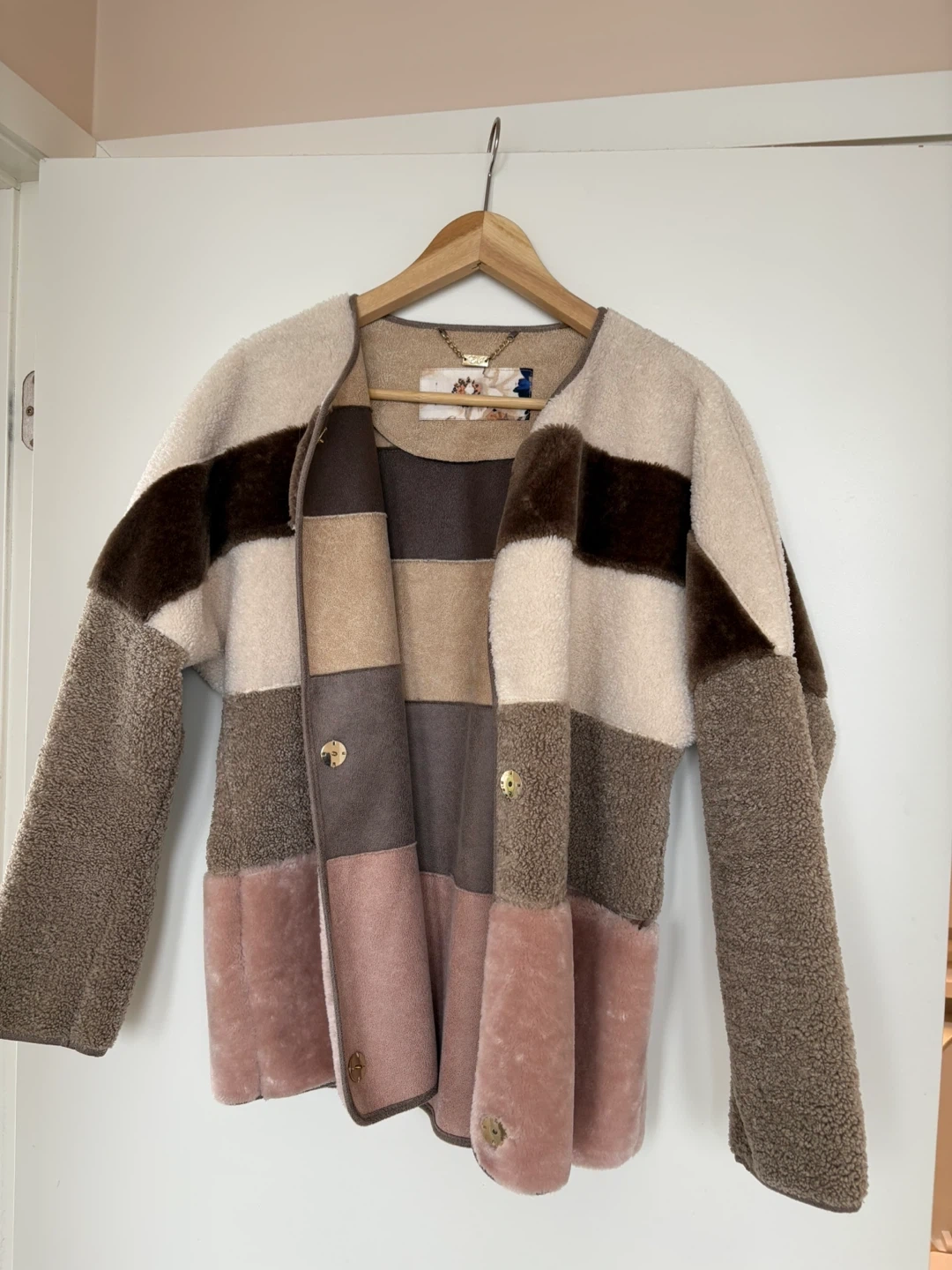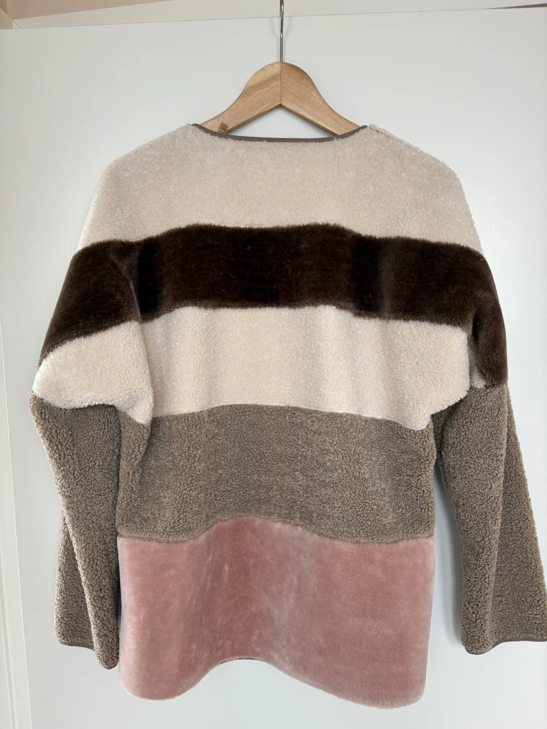 Selling a cozy cardigan with a unique striped design! It features a mix of neutral tones like cream, brown, and a touch of pink. Perfect for adding a stylish and warm layer to any outfit.