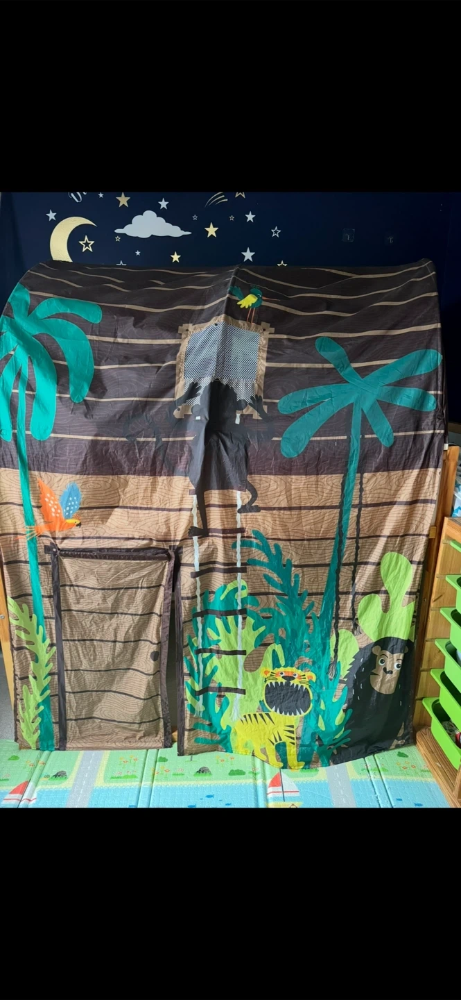 A fun jungle-themed play tent for kids! Comes with all the poles needed for assembly. Perfect for indoor adventures and imaginative play