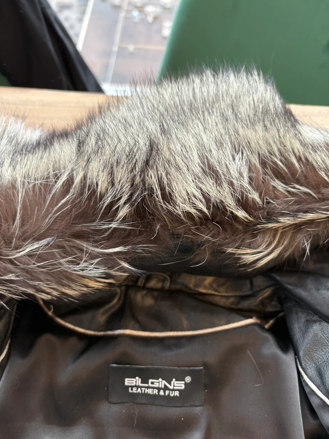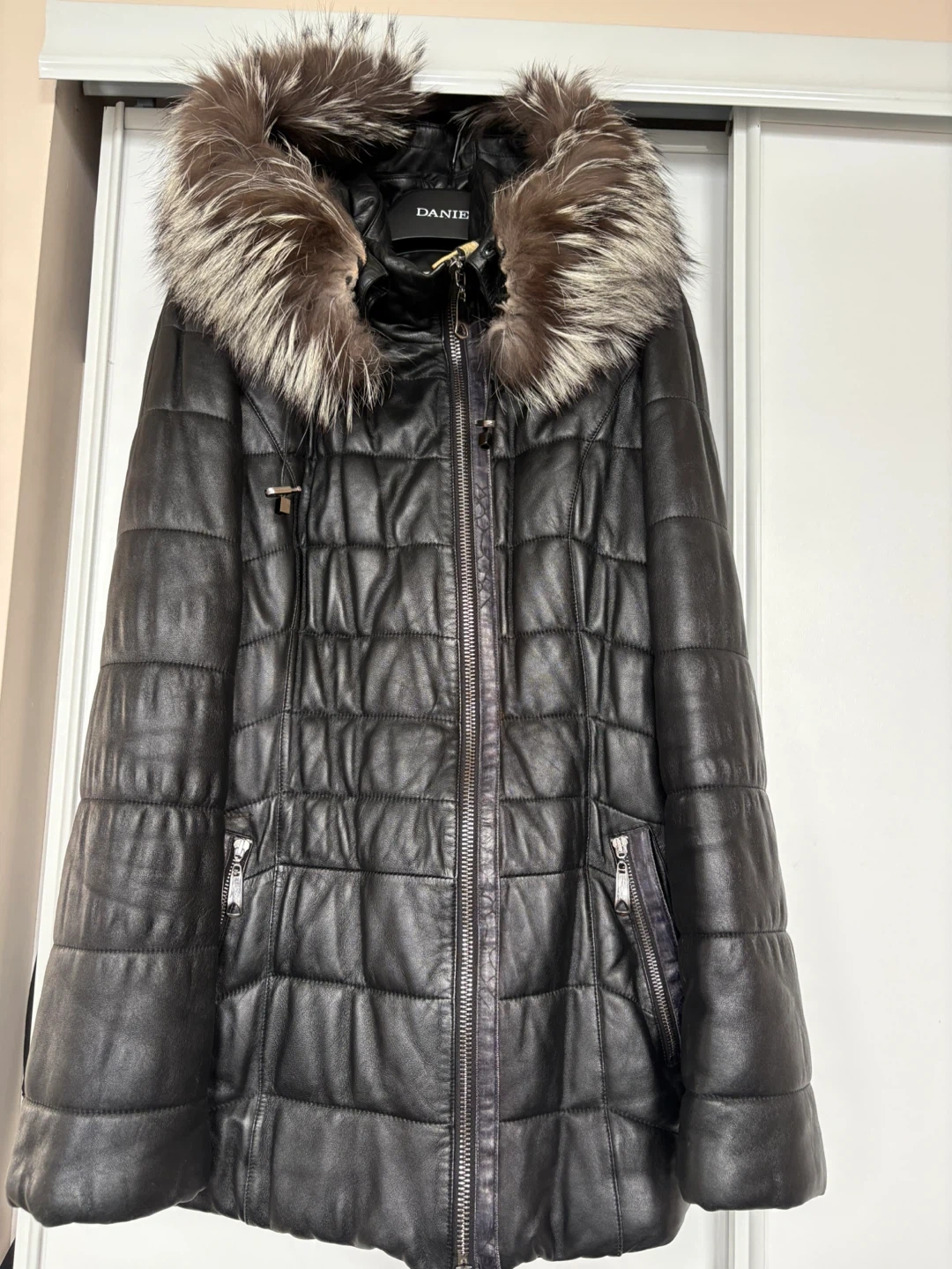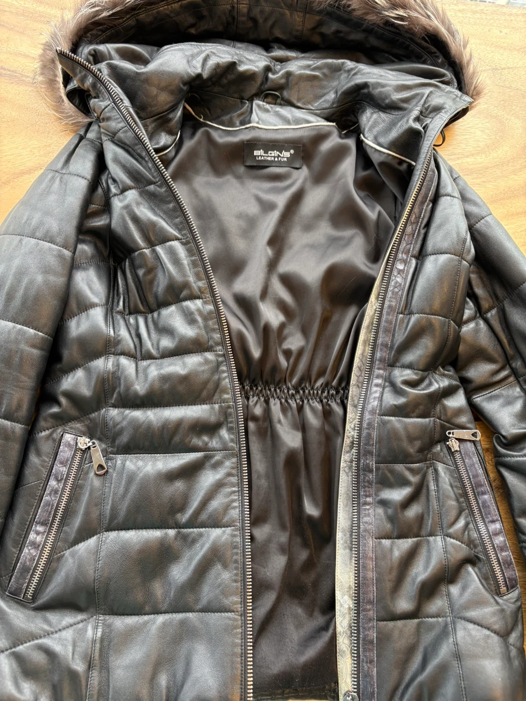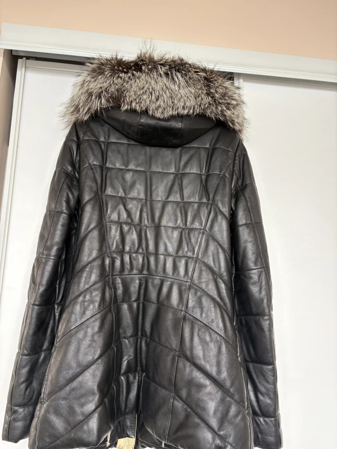 Selling a stylish black jacket Leather & Fur. It features a quilted design and a fur-trimmed hood, perfect for staying warm and fashionable. The jacket has a zipper closure and additional zipper details on the pockets. It's in great condition and ready for a new home!