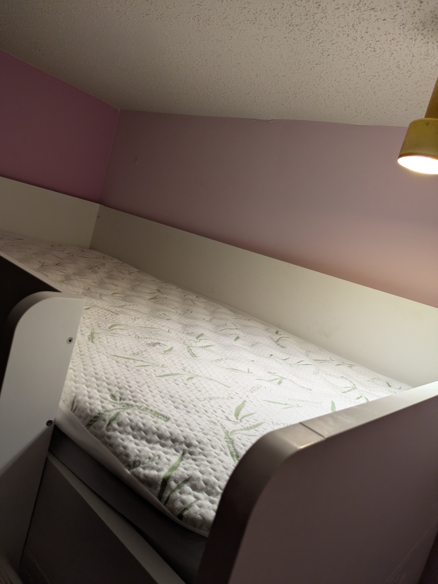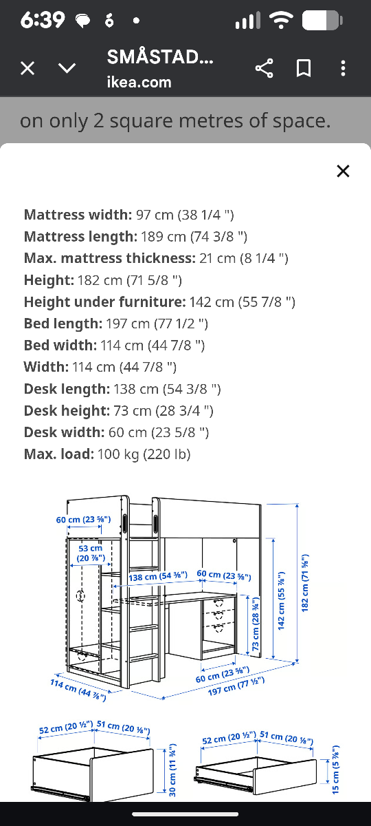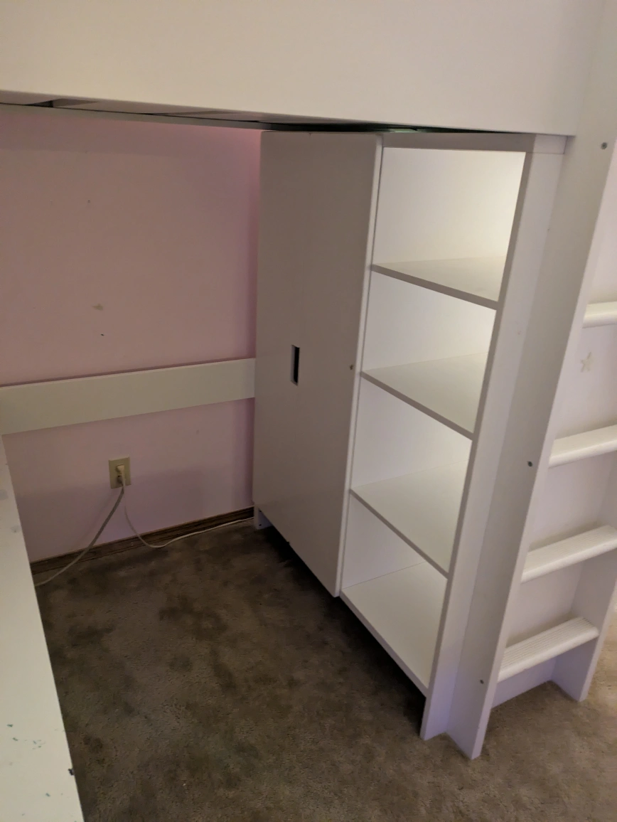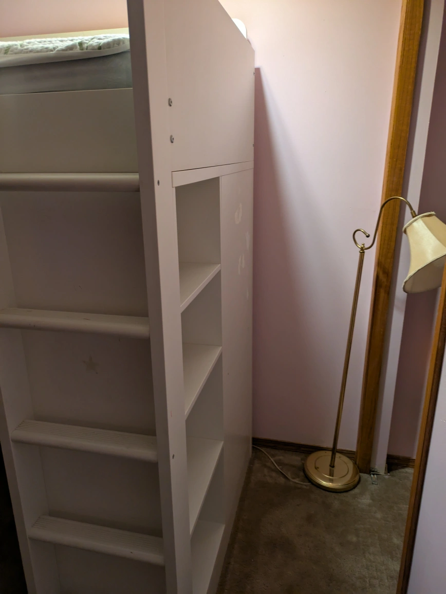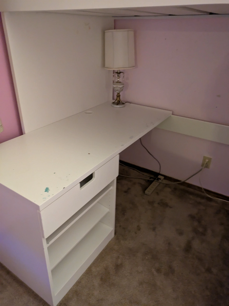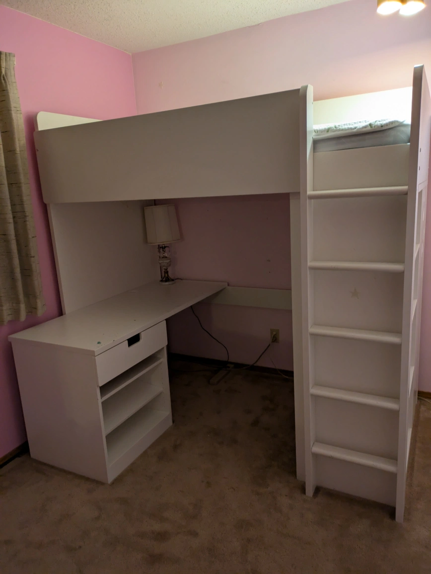 Selling a IKEA white loft bed that comes with a built-in desk and storage shelves. It's a great space-saver for smaller rooms! There are some minor cosmetic imperfections on the desk surface, but overall it's in good condition and very sturdy. Perfect for a student or anyone needing a compact setup