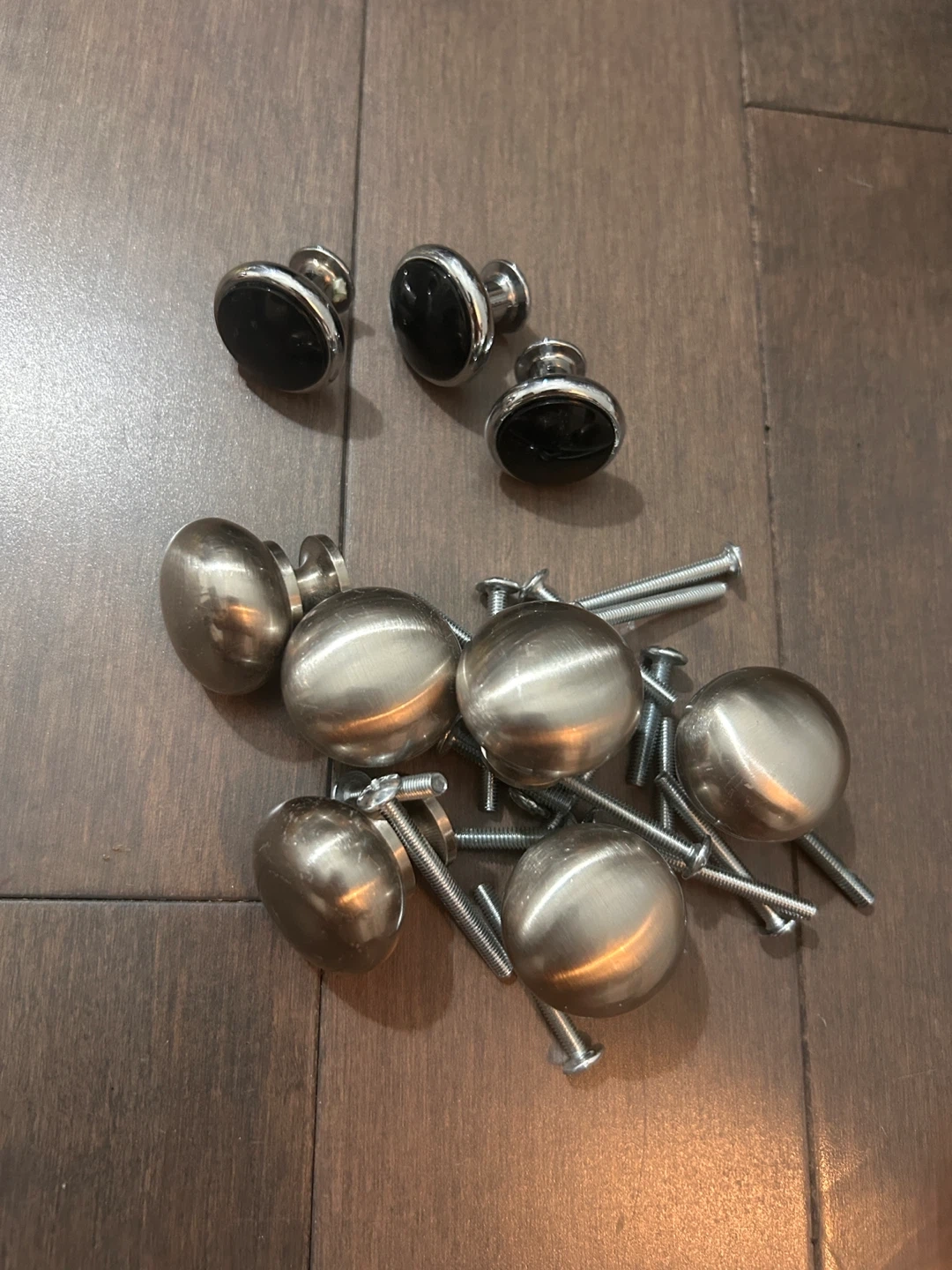Selling a set of cabinet knobs. There are two different styles included: a rounded silver knob and a silver knob with a black accent. Perfect for updating your kitchen or bathroom cabinets!