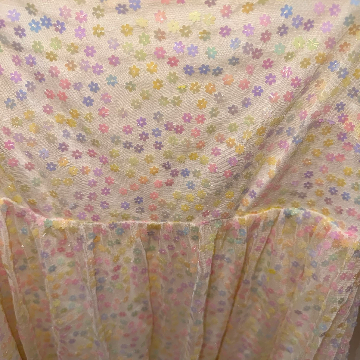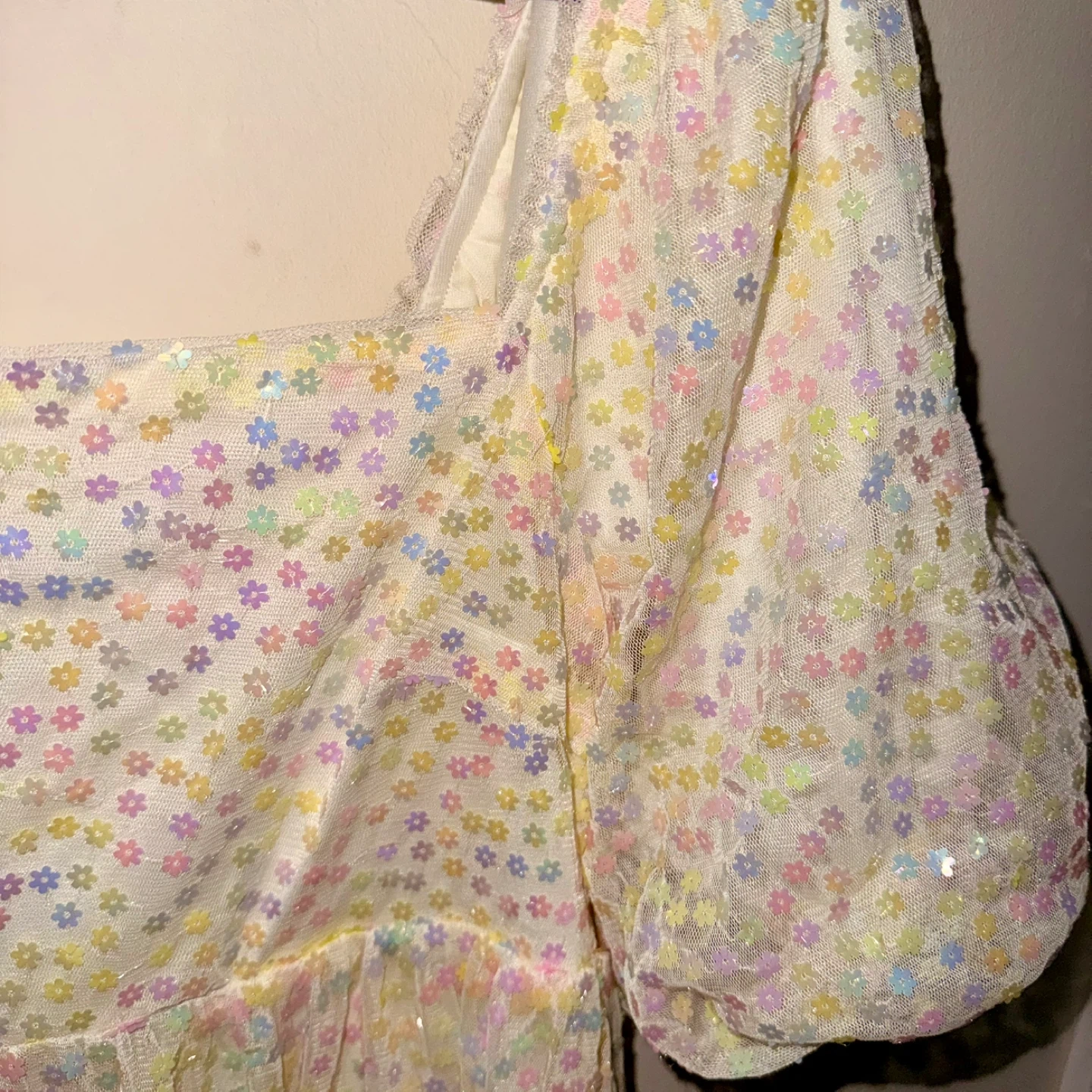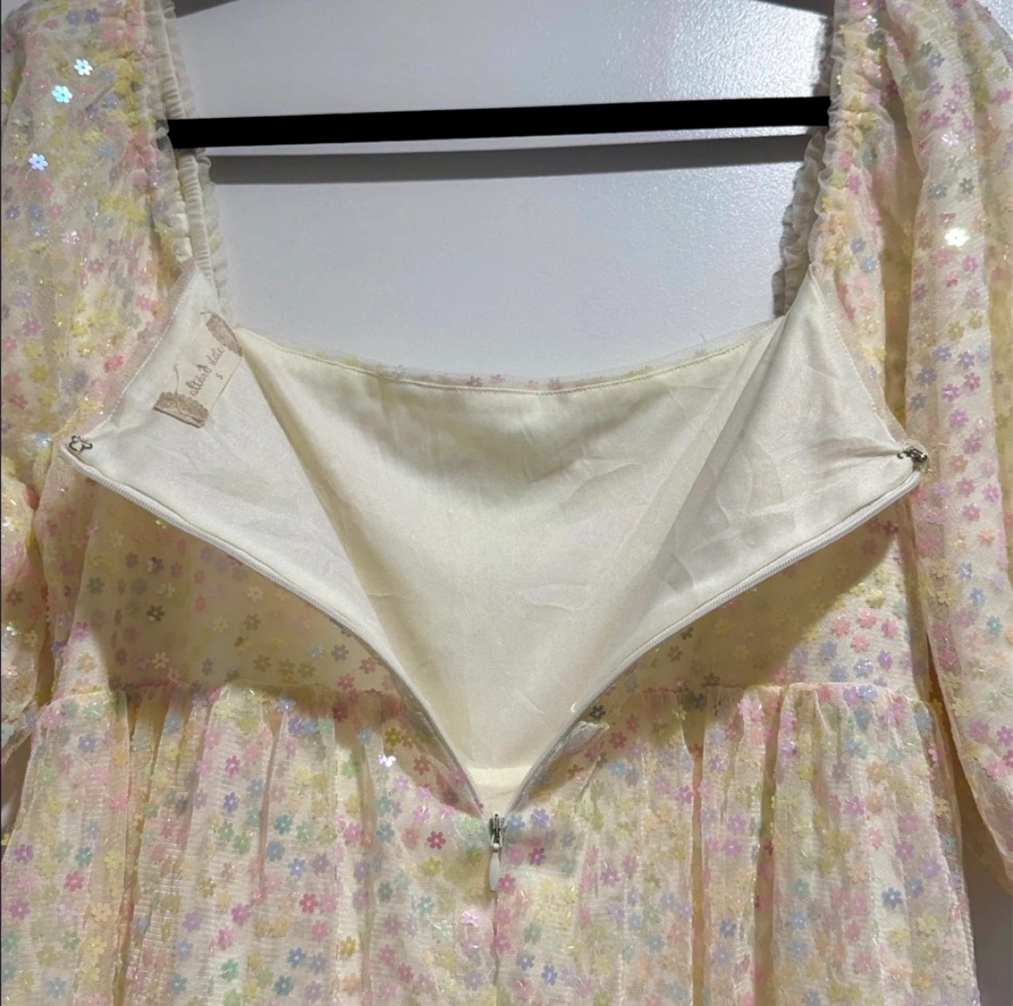 Size small. Worn once. Reflects all sorts of colours and is gorgeous. Pair with a pair of cowgirl boots and a denim jacket or a trench coat and a cute handbag. No flaws to note. Zips up in the back. Square neck line.