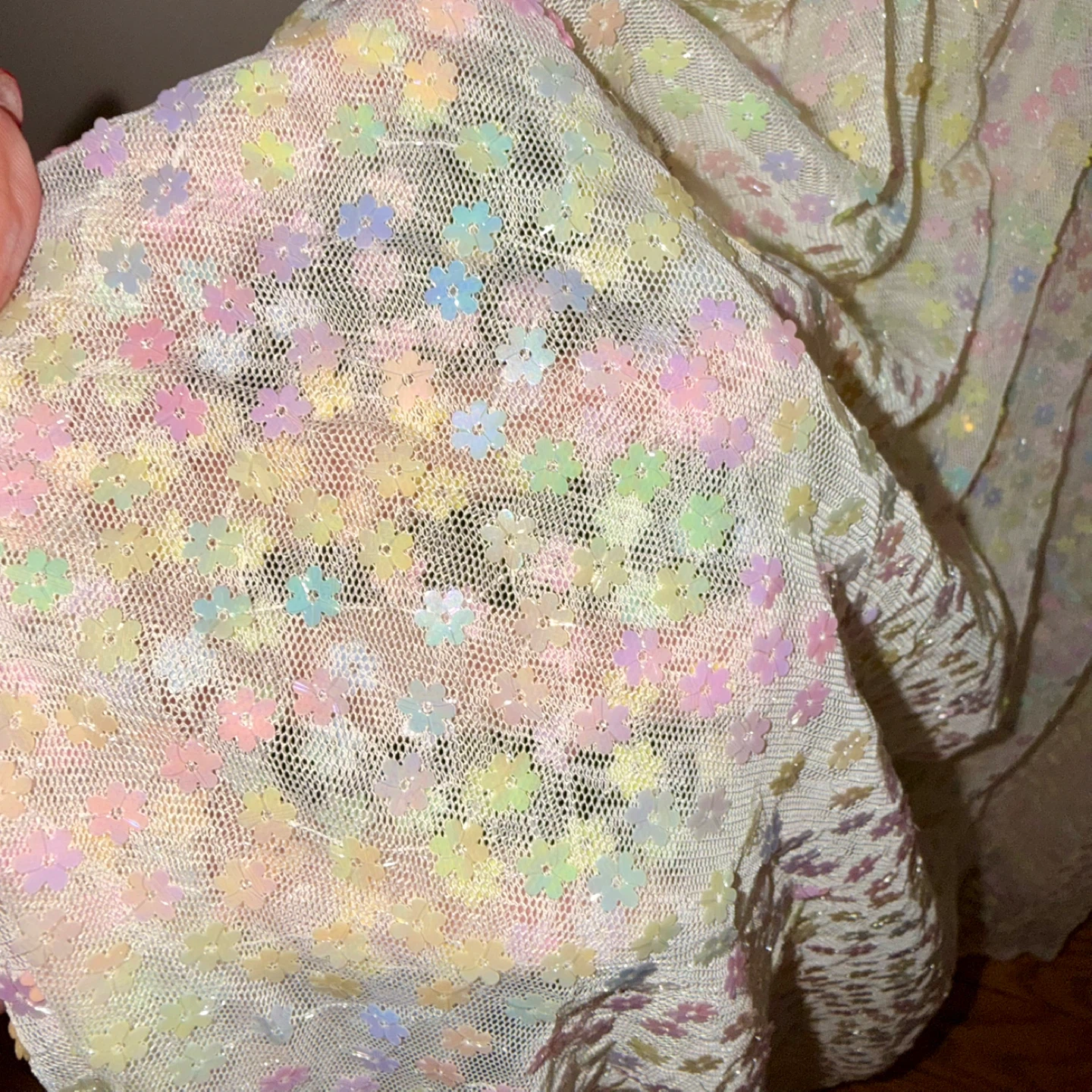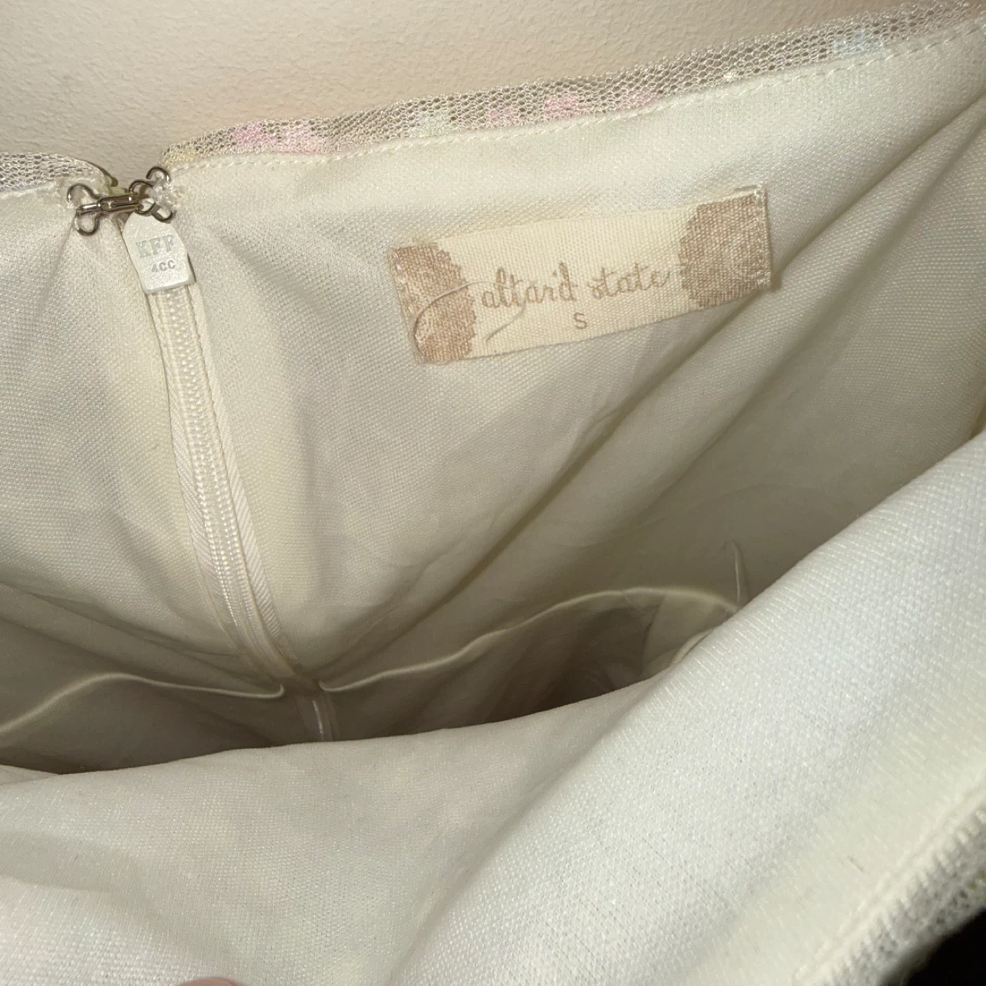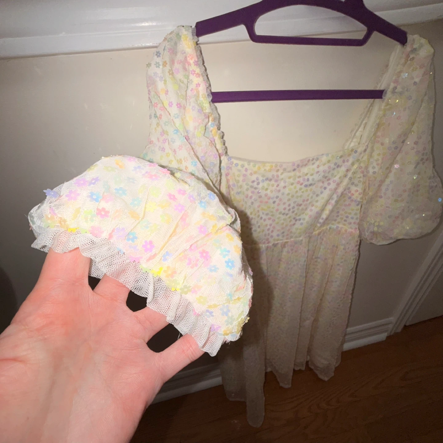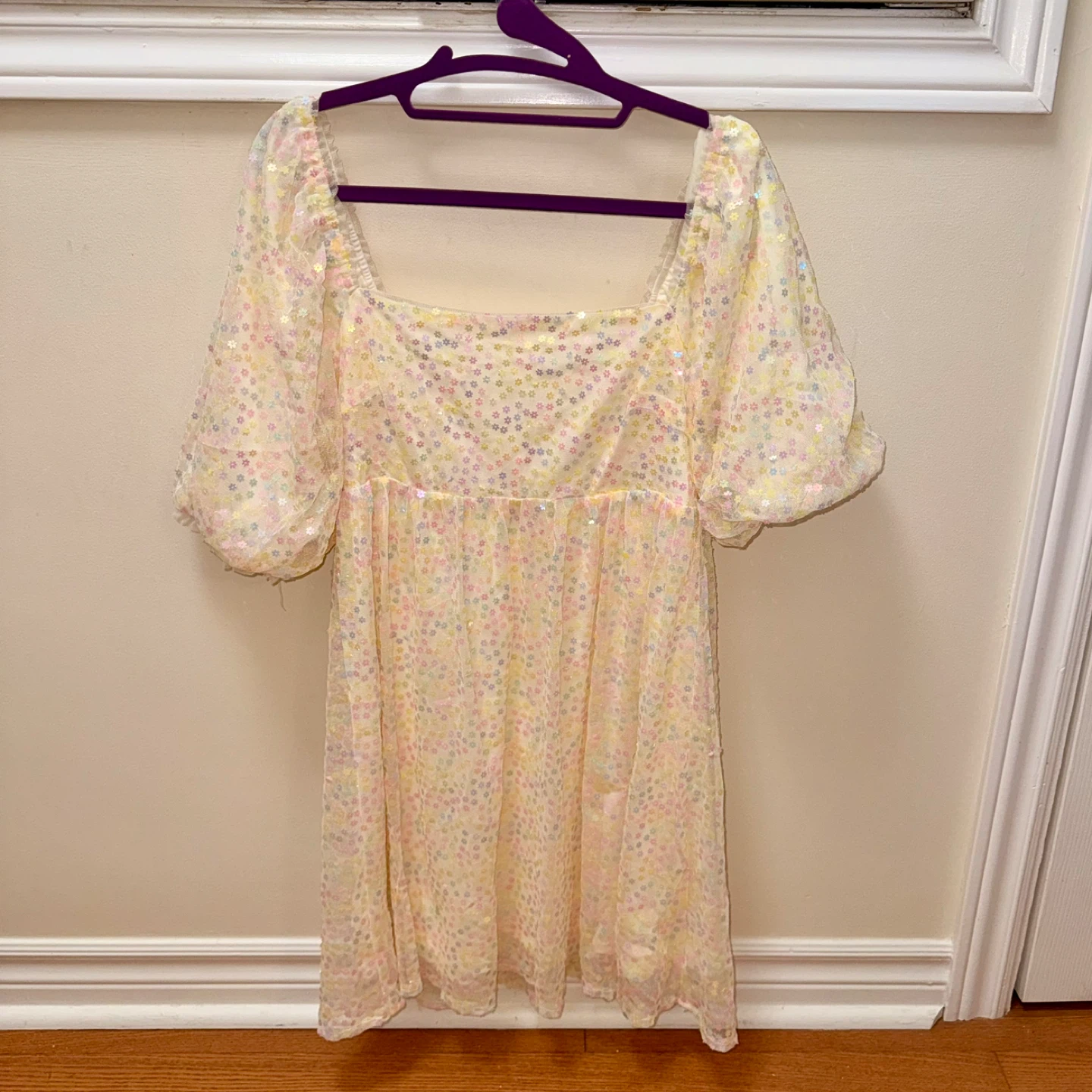 Size small. Worn once. Reflects all sorts of colours and is gorgeous. Pair with a pair of cowgirl boots and a denim jacket or a trench coat and a cute handbag. No flaws to note. Zips up in the back. Square neck line.