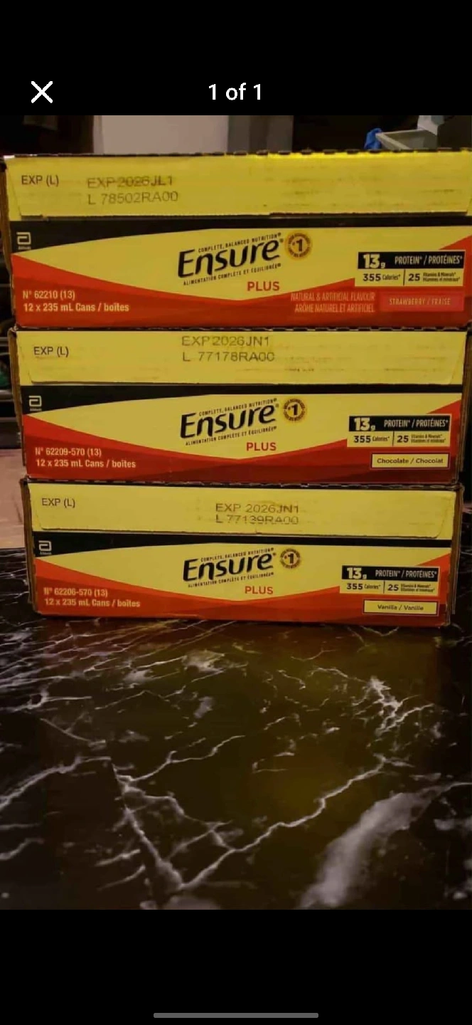 Selling a variety pack of Ensure Plus nutritional drinks. Each box contains 12 x 235mL cans. You'll find flavours like Strawberry, Chocolate, and Vanilla. Expiry dates are in 2026!