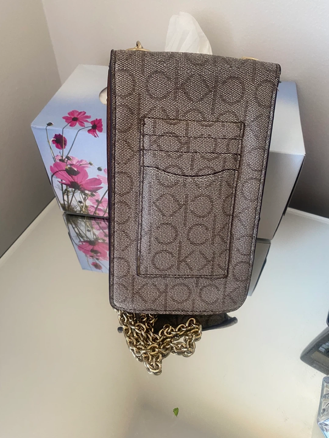 10Check out this stylish Calvin Klein crossbody phone bag! It’s in great condition and perfect for keeping your phone and essentials close at hand. The brown colour and CK logo pattern add a touch of sophistication, and the gold chain strap is super trendy