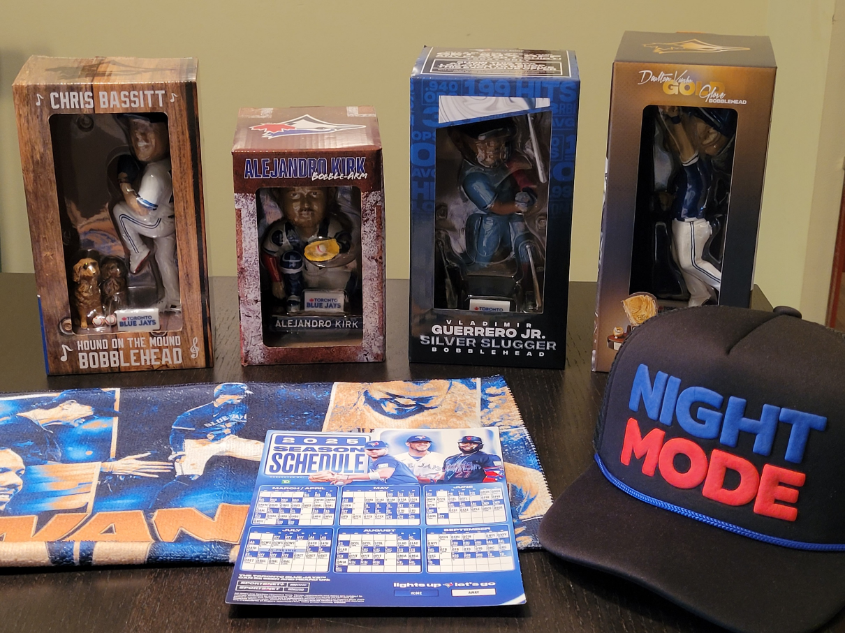 Selling a collection of Blue Jays memorabilia! Included are Vladimir Guerrero Jr., Daulton Varsho, Chris Bassitt, and Alejandro Kirk bobbleheads (all unopened), along with a City Connect truckers hat (never worn), a 2025 magnet season schedule, and rally flag from the ALDS. A fantastic deal and a great collection for any Blue Jays fan! Go Jays!!