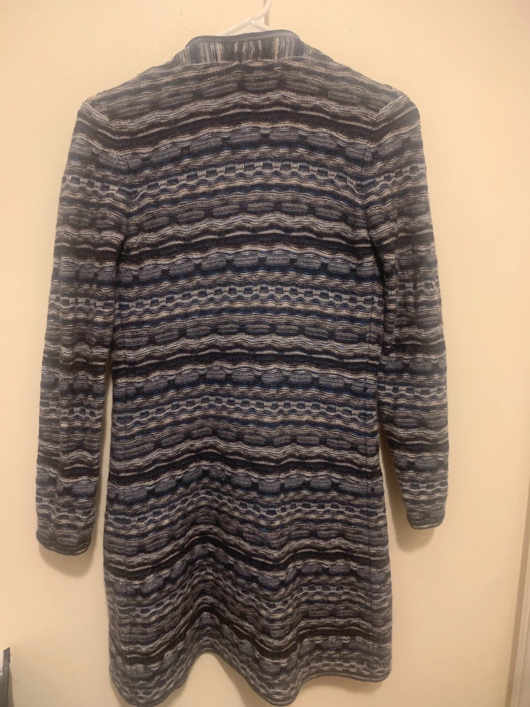 Here's a cozy cardigan made from a blend of 60% virgin wool, 20% rayon, 13% nylon, 4% alpaca, and 3% polyester. Striped pattern in shades of blue, grey, and black. Perfect for layering!