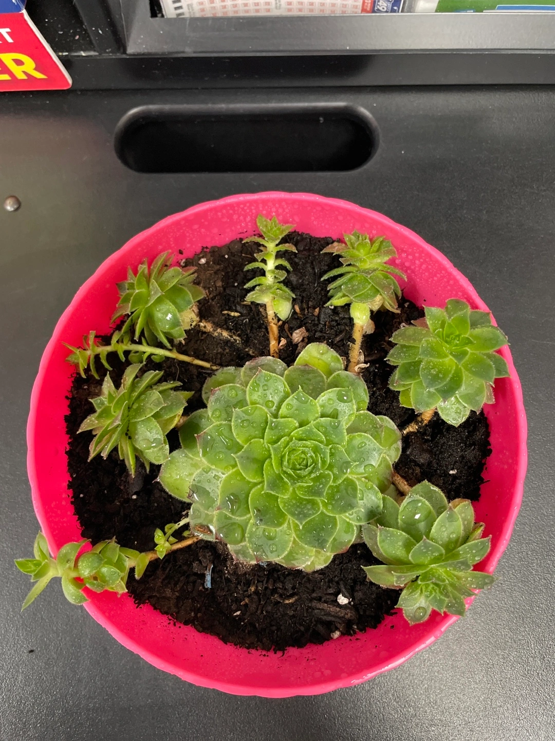 a lovely hen and chicks succulent in a pink pot! It's a lovely addition to any indoor space and super easy to care for. The plant features a variety of small succulents arranged around a larger central rosette, all nestled in fresh soil. Perfect for adding a touch of green to your home or office!