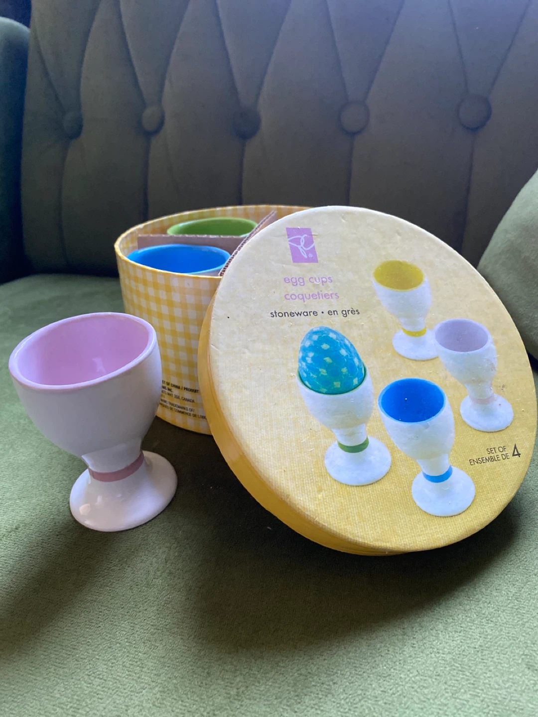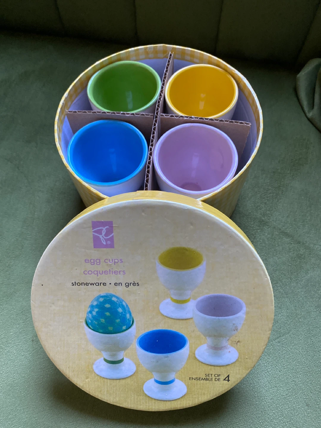 Selling a set of 4 egg cups made of stoneware. They come in a variety of colors: green, yellow, blue, and lavender. The set includes the original box never used vintage