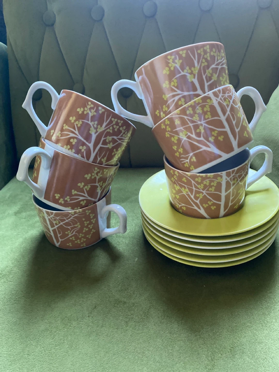 Selling a set of vintage tea cups with saucers! The cups have a unique tree design in white and yellow on a brown background, with white handles. The saucers are a bright yellow. They're perfect for adding a touch of retro charm to your tea time