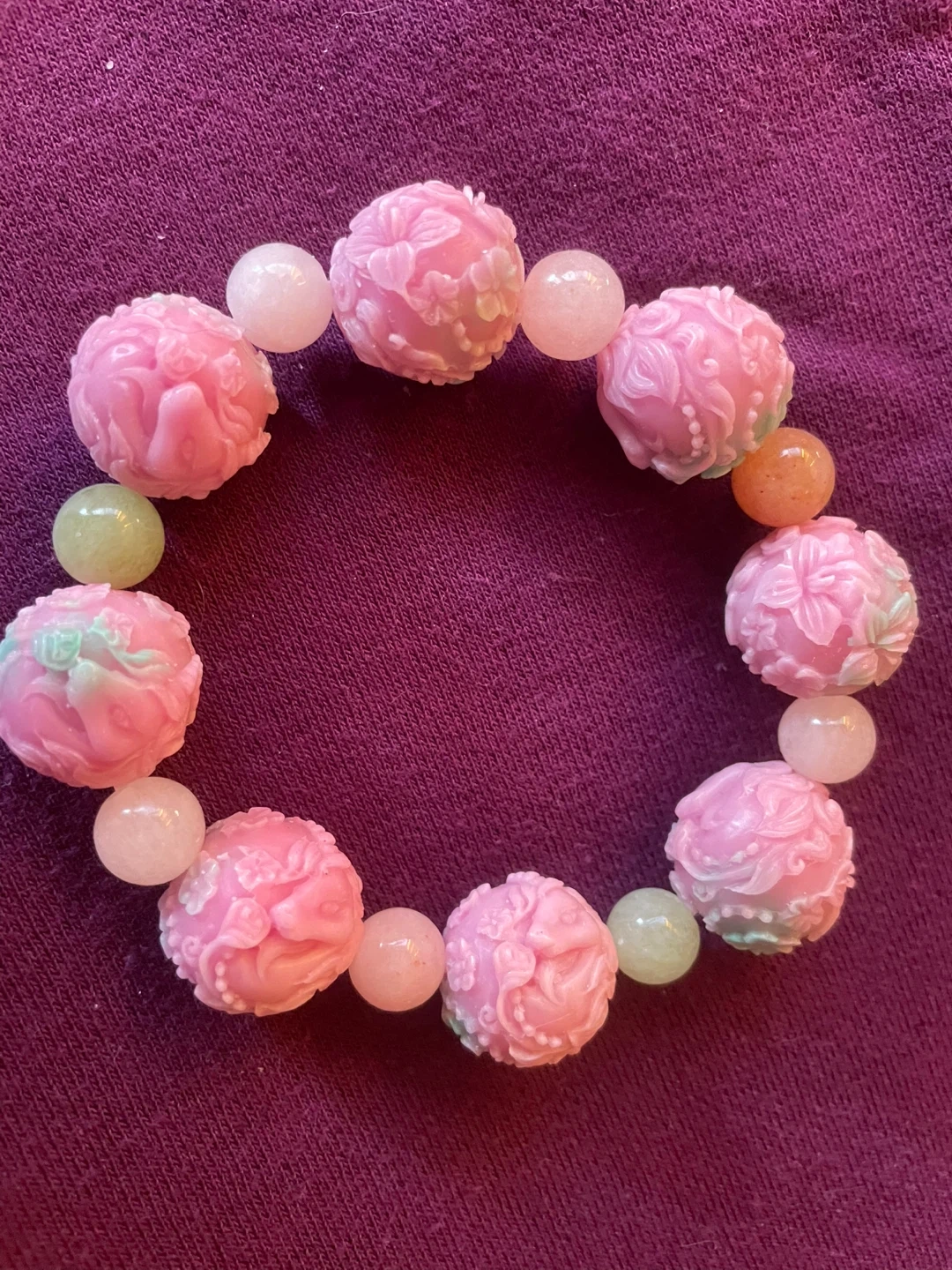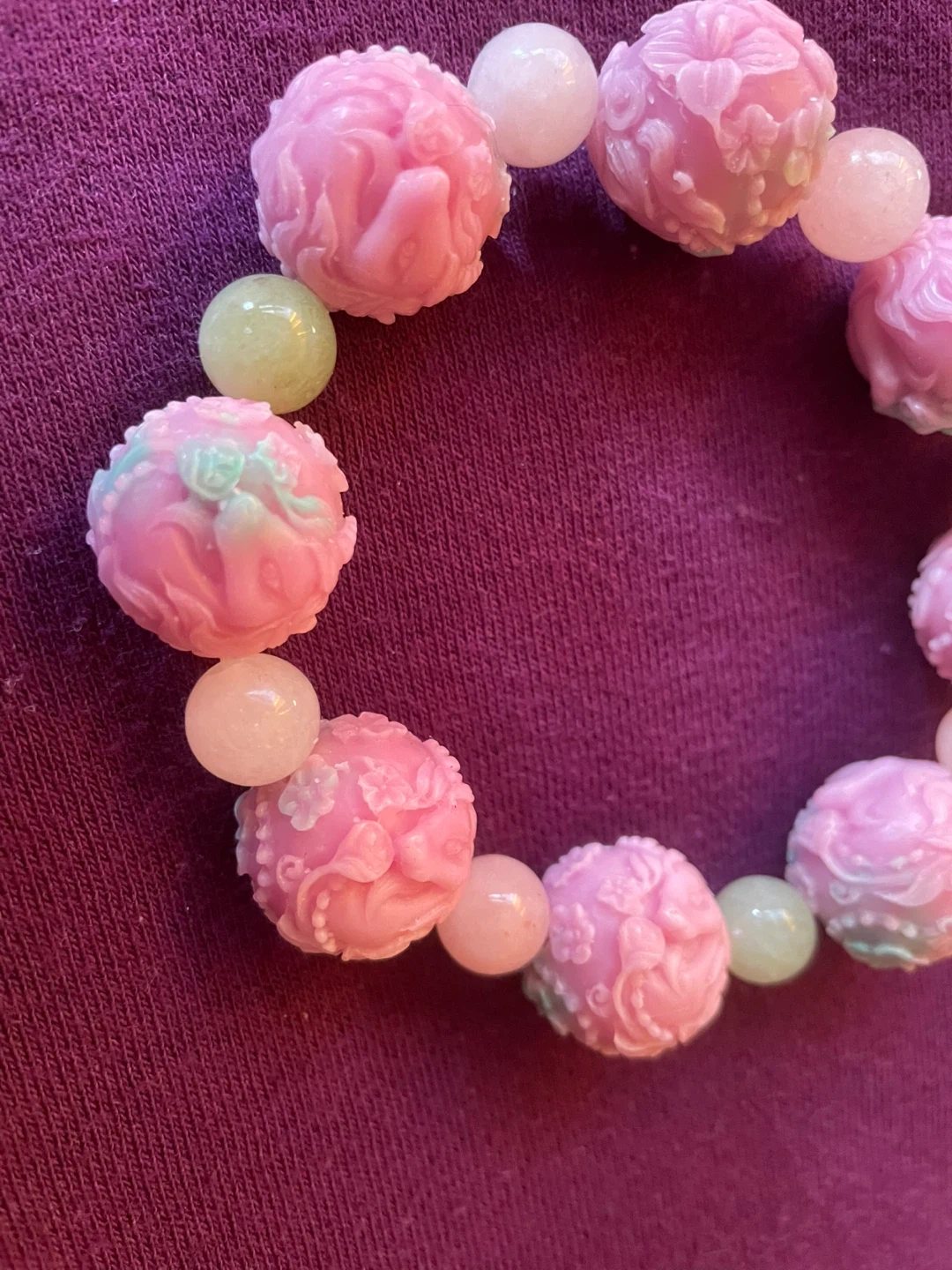 Special pink beaded bracelet. It features floral carved 12mm stones with 8mm stones in various shades of pink and green. Perfect for adding a touch of charm to any outfit!