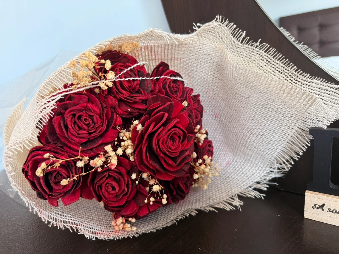 A beautiful bouquet of red roses, perfect for any occasion! It's wrapped in a rustic burlap style material, giving it a charming and elegant look