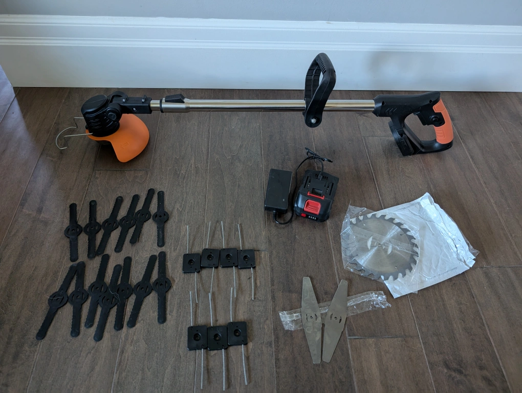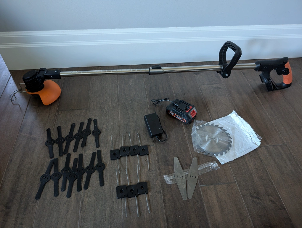 231Used, like new extending 21V stringless weed whacker for sale. Battery powered, trimmer for garden, yard, lawn, grass, 4 types of blades – metal, circular saw, wire, and plastic, battery and charger, garden and yard lawnmower, $50 FIRM. Trimmer, Weeds, Lawnmower, Cut, Trim, Lawn, Grass, Weed, Battery, Portable, Cordless, Wireless, Garden, Yard, Lawn Mower, Cutting, Mower, Blade, Saw, Mow