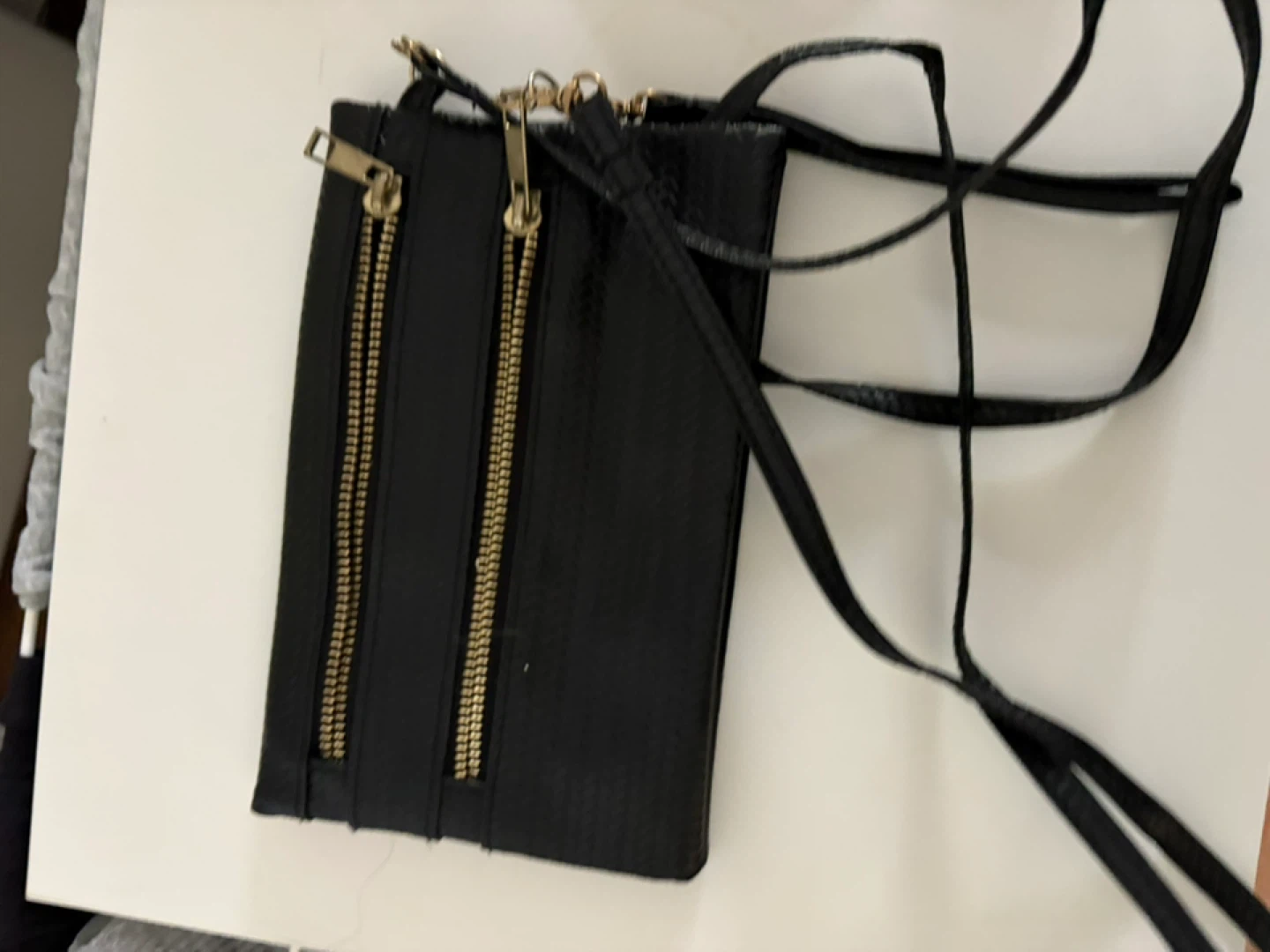 Selling a cute Ardene black wallet crossbody bag. It has a few compartments and zippers to keep your items organized. It's perfect for carrying your essentials!
