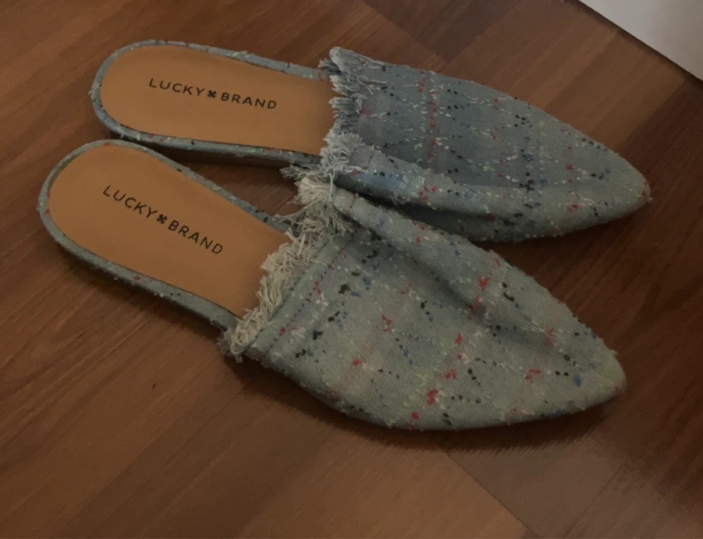 Selling a pair of Lucky Brand mule slides in size 9. They have a unique tweed-like material and a comfortable slip-on design.