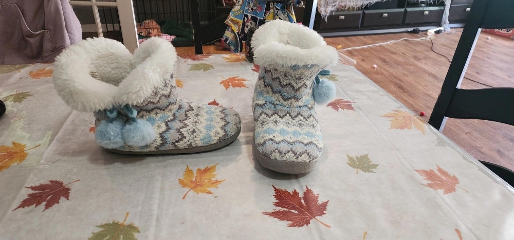 48Snuggle up in these adorable slipper boots! They feature a soft, plush lining and cute blue pom poms for an extra touch of charm. Perfect for keeping your feet warm and cozy on chilly days size 13/1