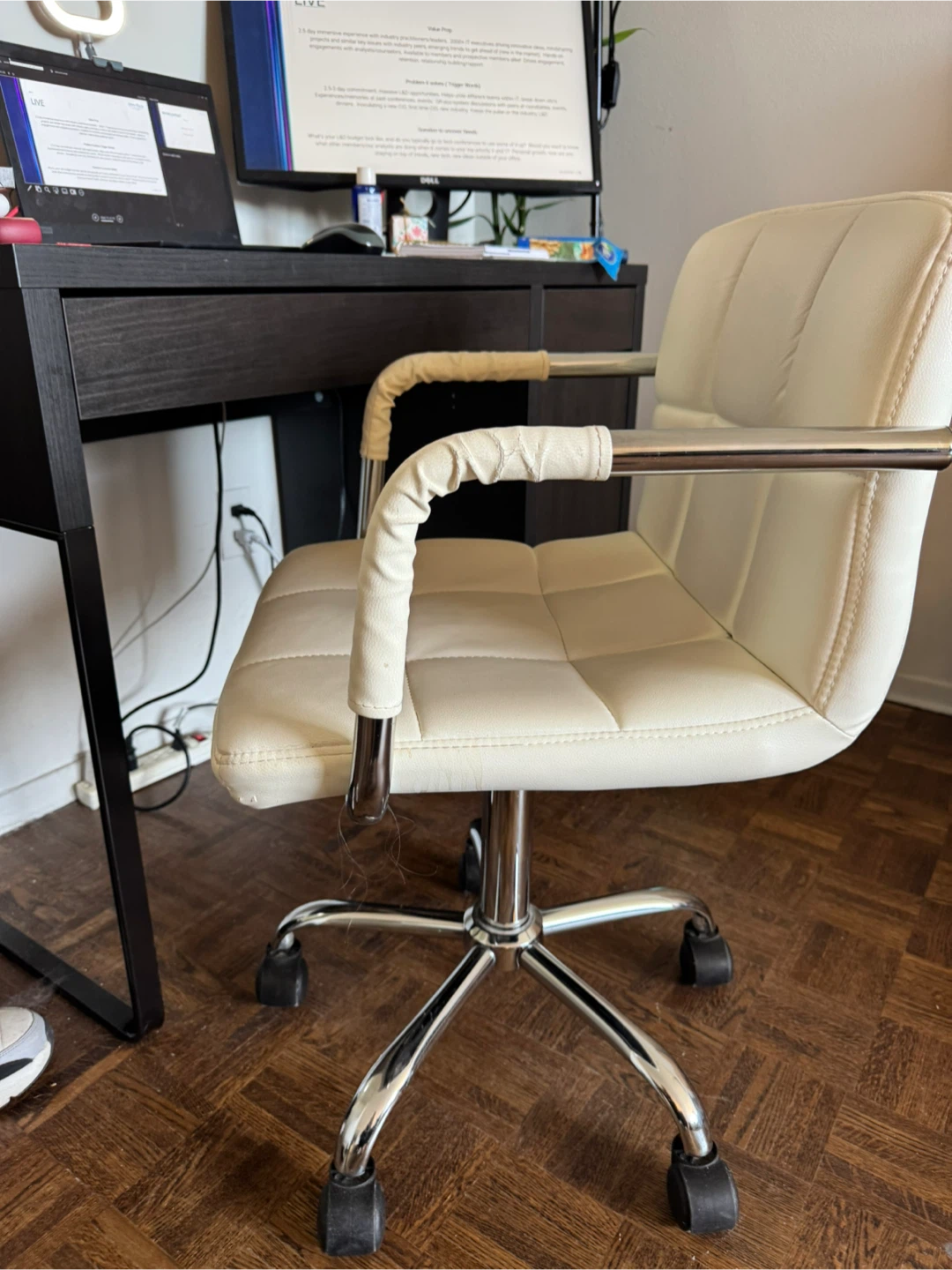 Selling a white office chair. It has a chrome base with wheels and a padded seat and back for comfort. Perfect for a home office or student! Some usage signs as shown in the pictures.