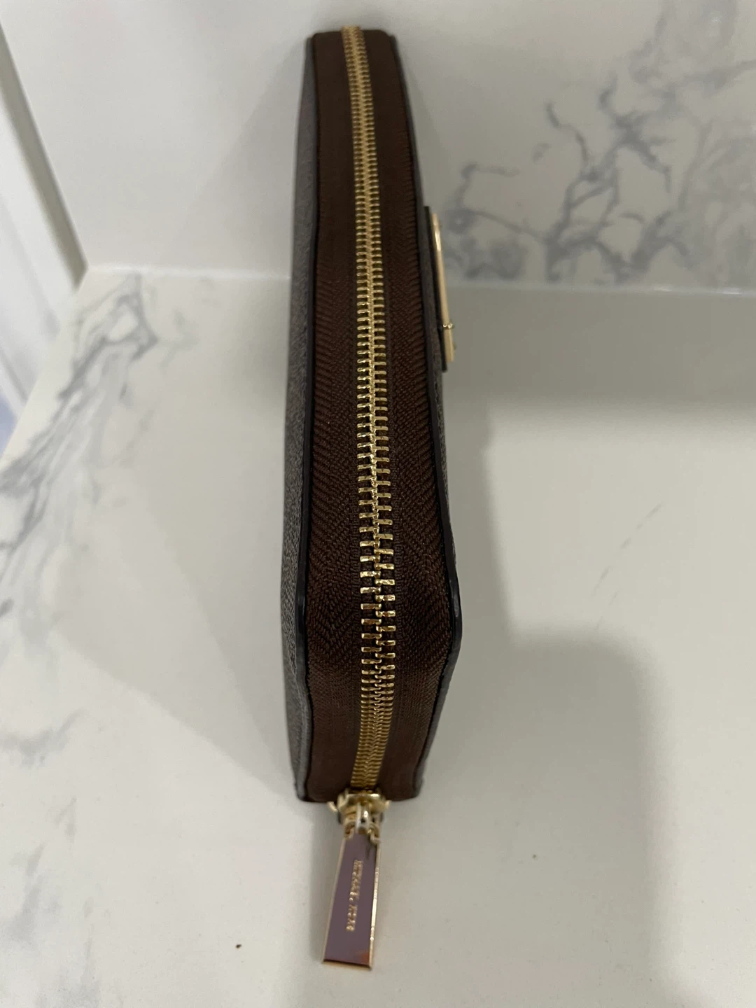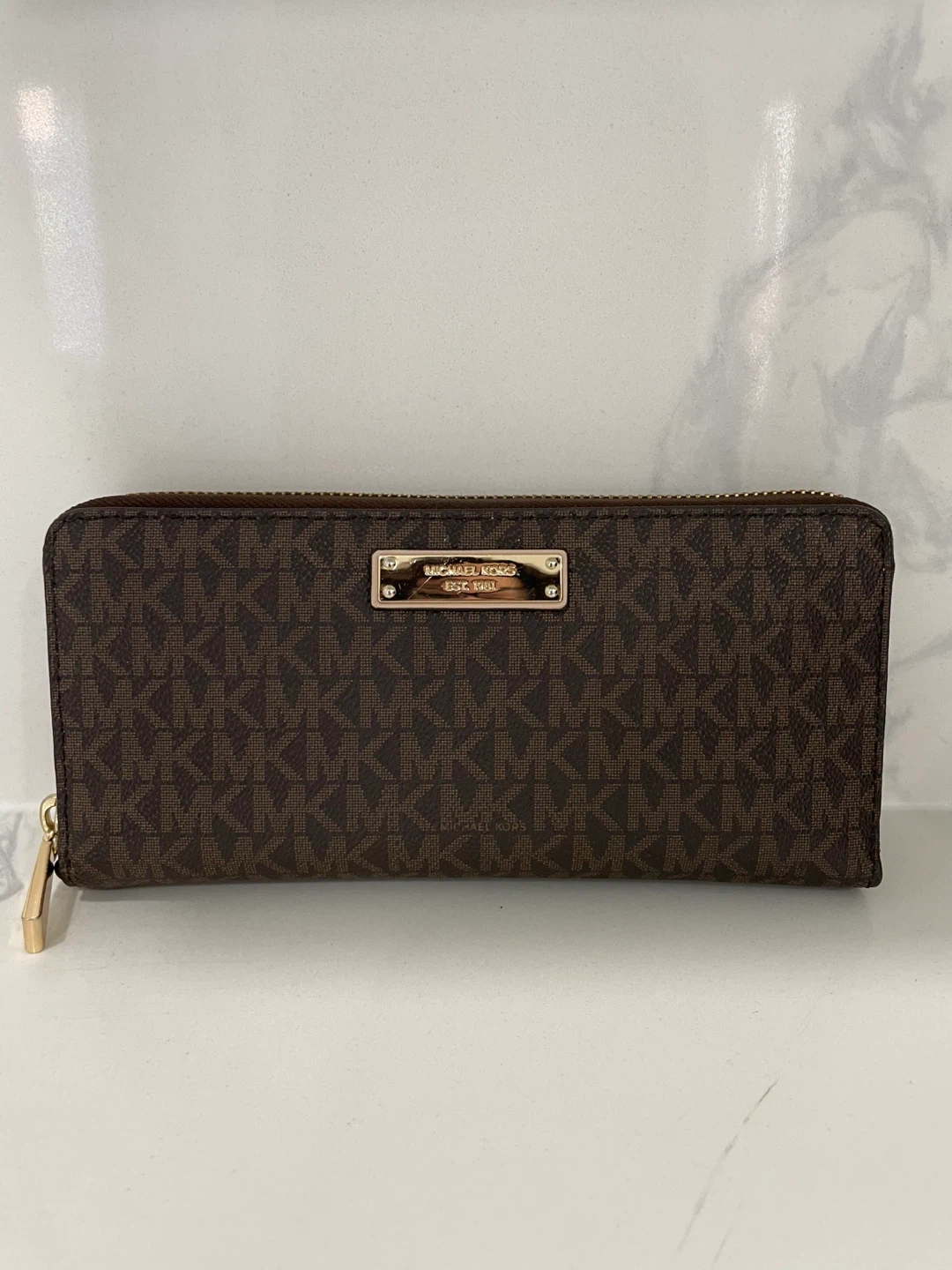 Selling a Michael Kors zip around wallet in brown. It features the classic MK logo pattern. The interior is a light pink/nude colour. Lots of space for cards and cash! Gently used!