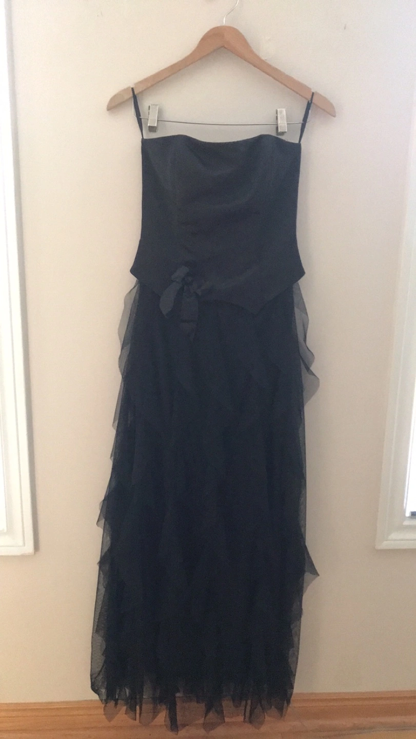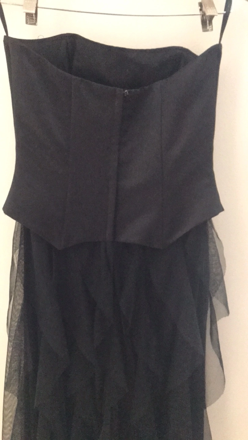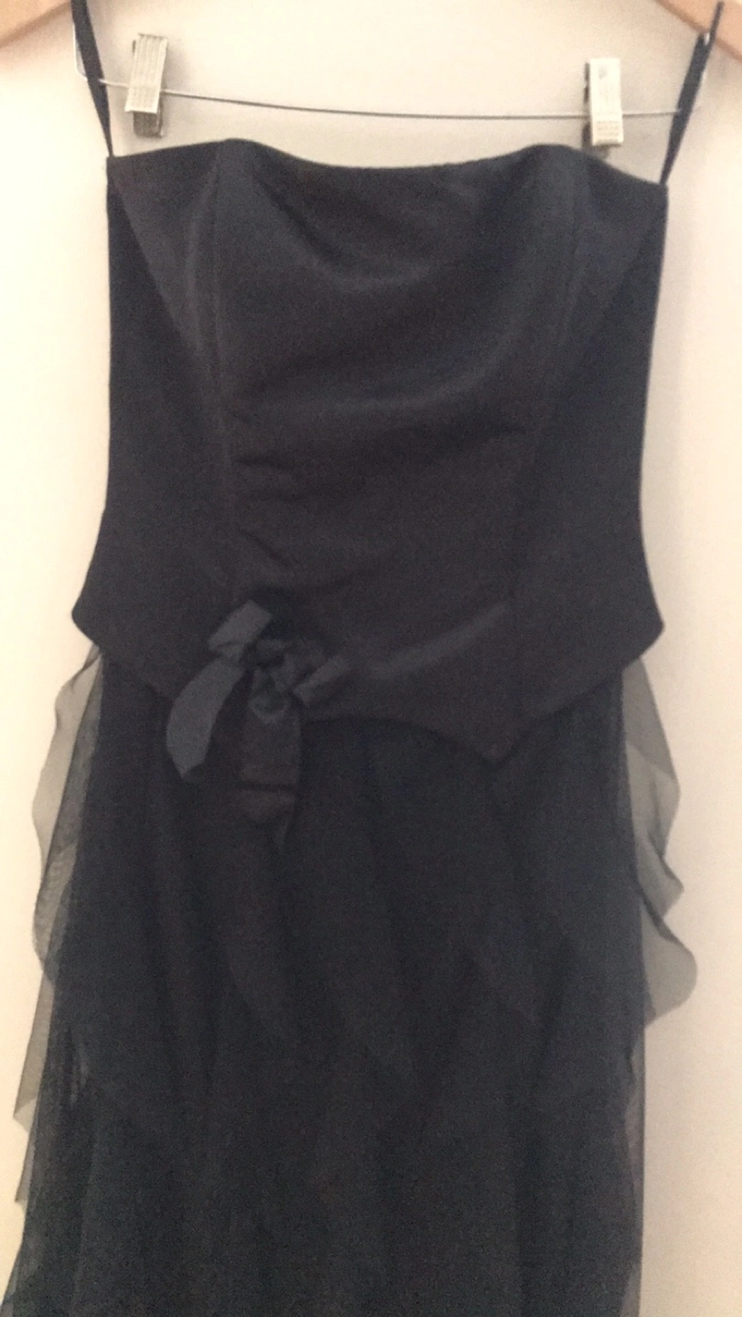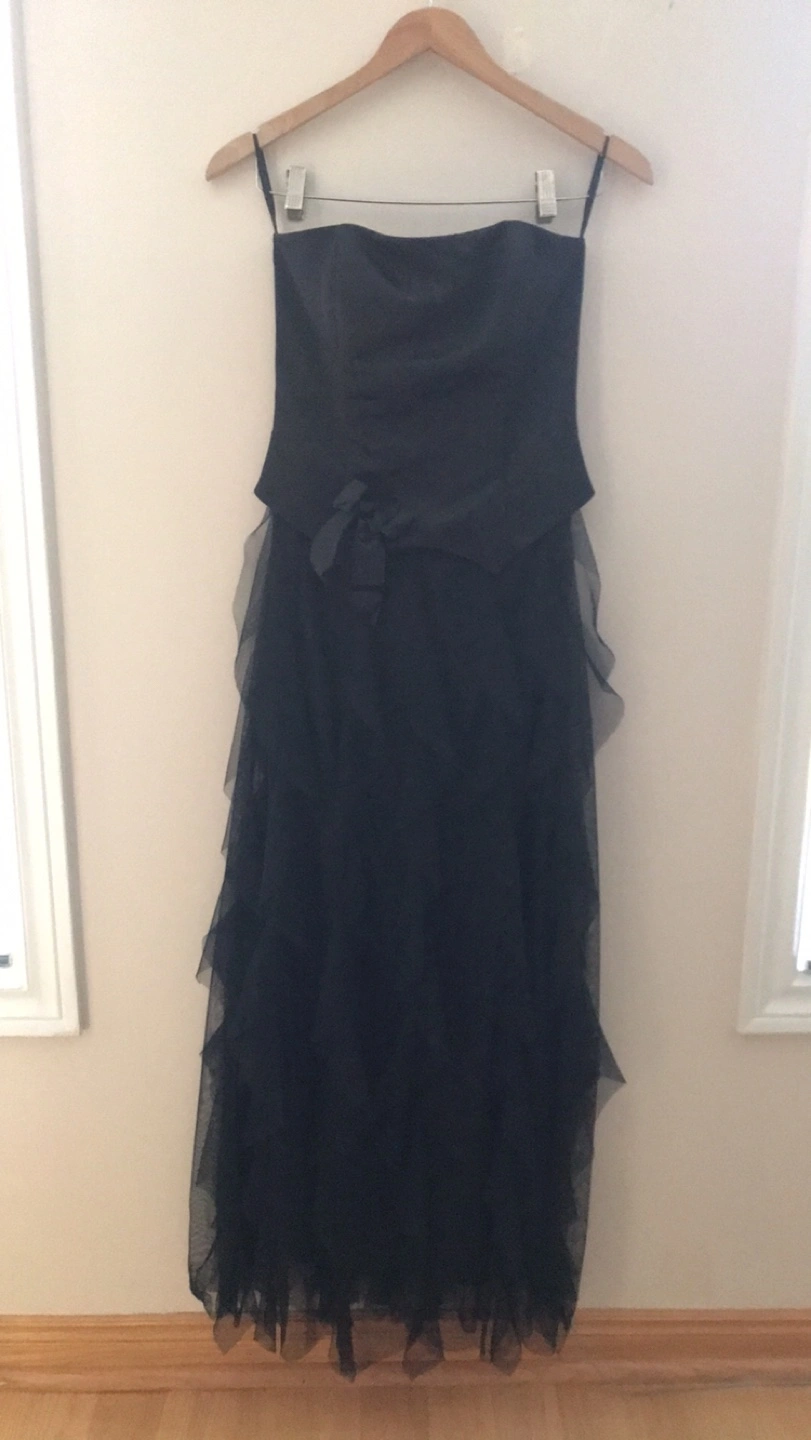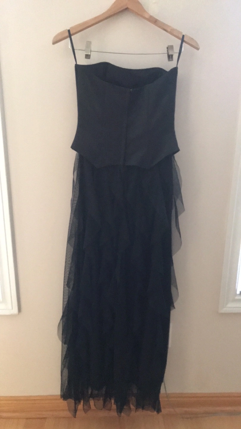 Selling a beautiful black strapless dress with a ruffle skirt. It features a bow detail at the waist and a layered tulle skirt. Perfect for a special occasion! Pick up location is 10 Alcorn Avenue Toronto M4V1E4