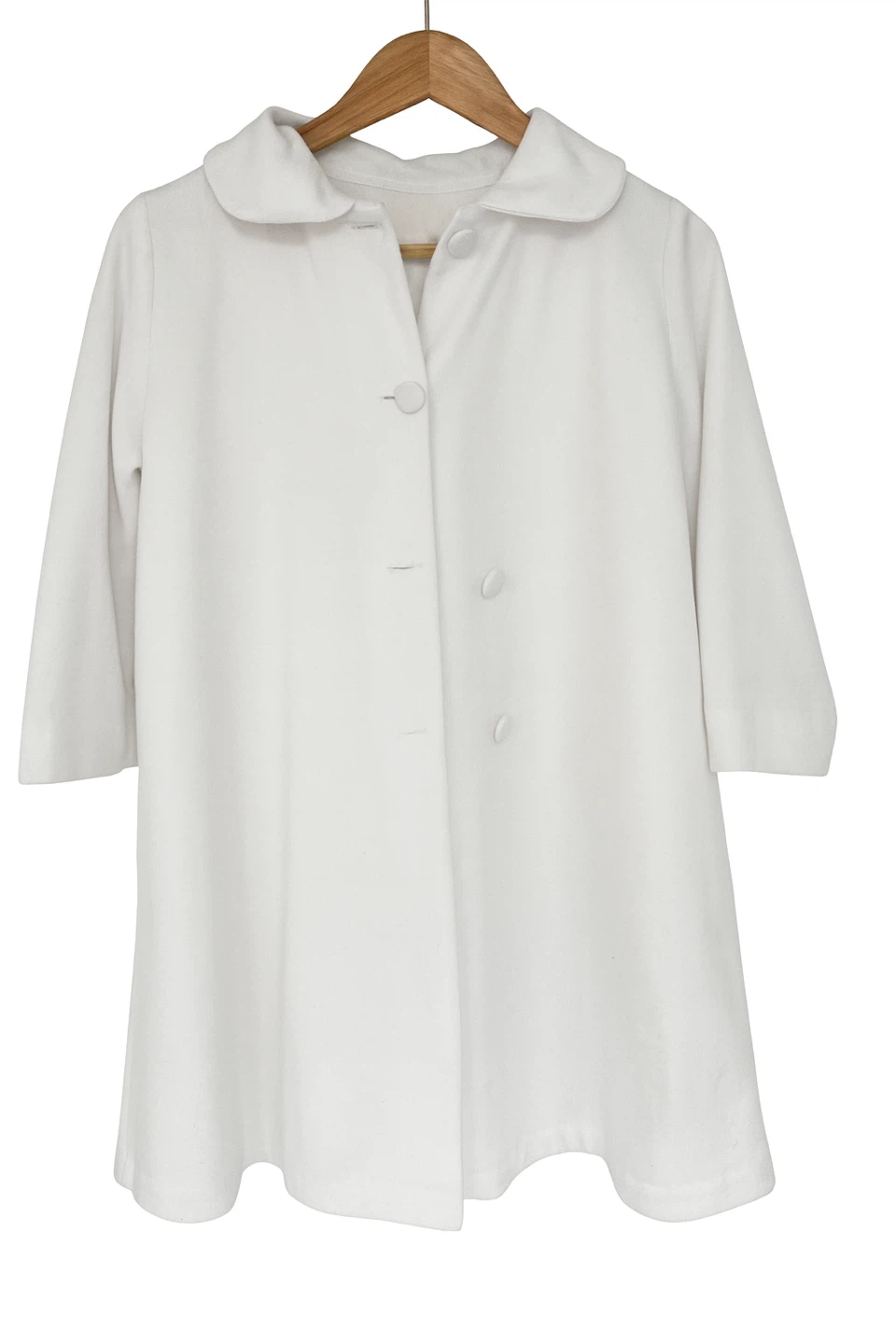 A lovely white coat, perfect for layering! It features a classic collar and button-down design. It's in great condition and ready for a new home