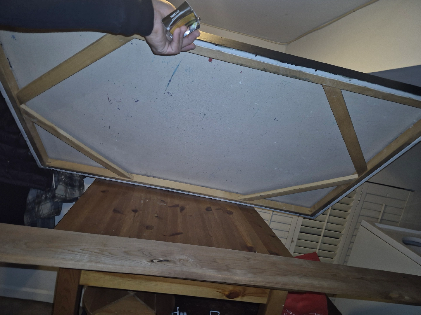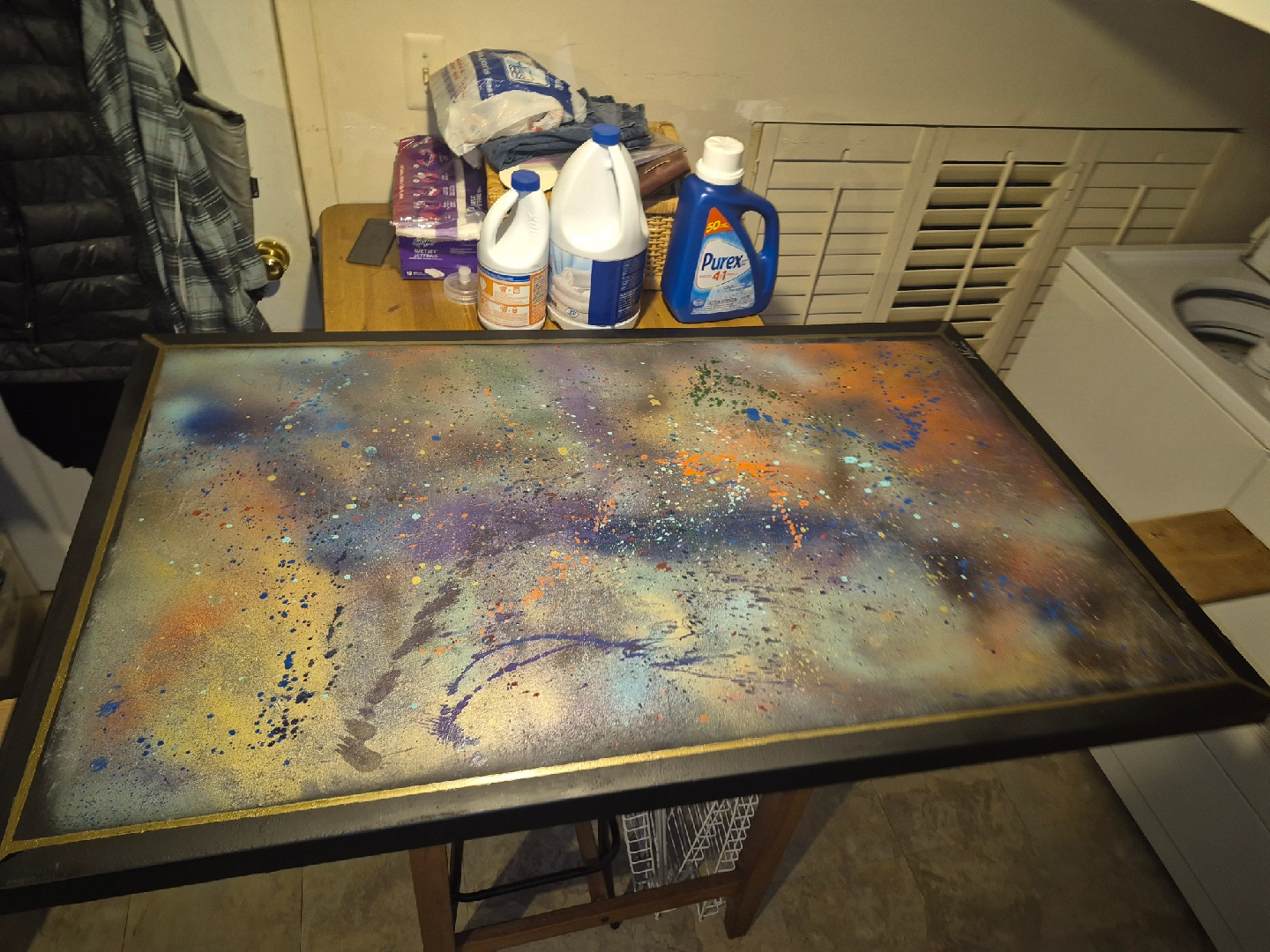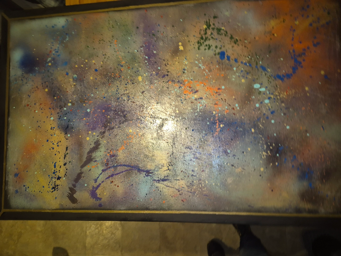 182Selling an abstract painting with a black frame. The painting features a mix of colours including gold, orange, purple, and blue. It could be a nice addition to your home decor! Painting name: the struggle done all by spray cans