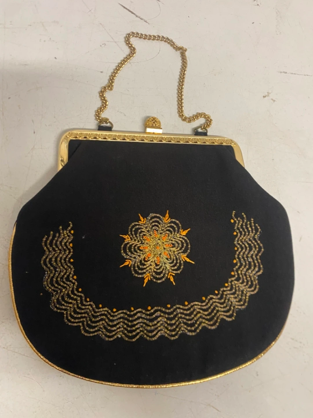 Selling a lovely vintage black velvet evening bag! It features a gold-tone metal frame and a delicate gold chain strap. The bag has a classic kiss-lock closure and is perfect for a night out or special occasion. There's some beautiful embroidery on one side too.It has a mirror inside marked Petite Bead.