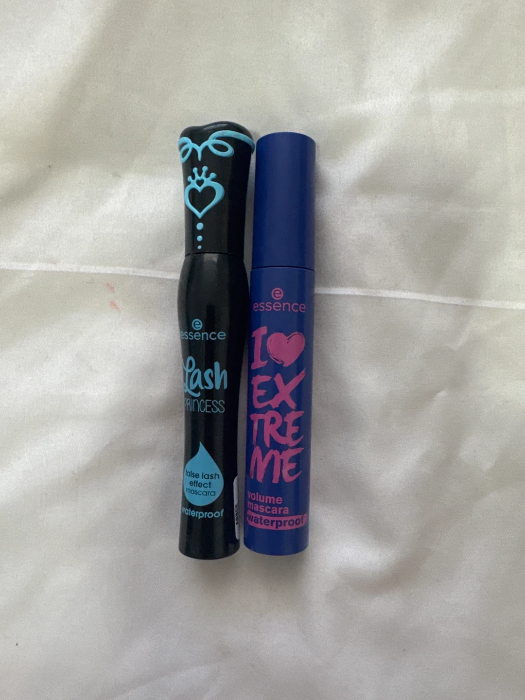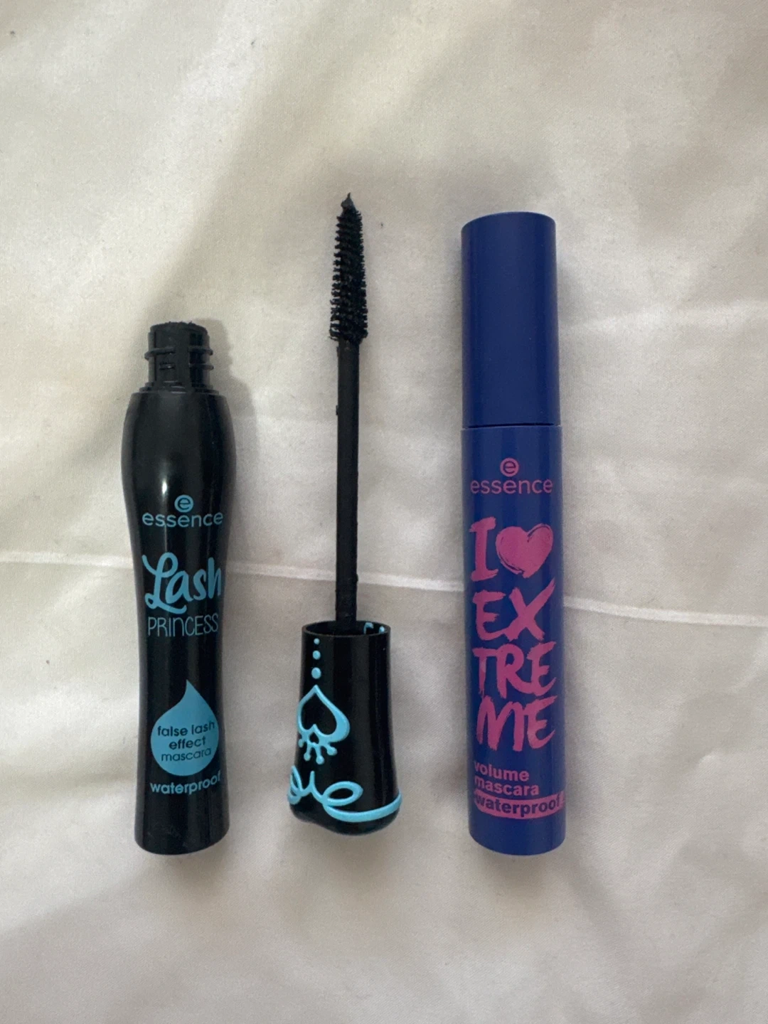 Selling two Essence mascaras! One is the Lash Princess False Lash Effect Mascara in black, and the other is the I <3 Extreme Volume Mascara, also in black and waterproof. Both are lightly used and ready for a new home!