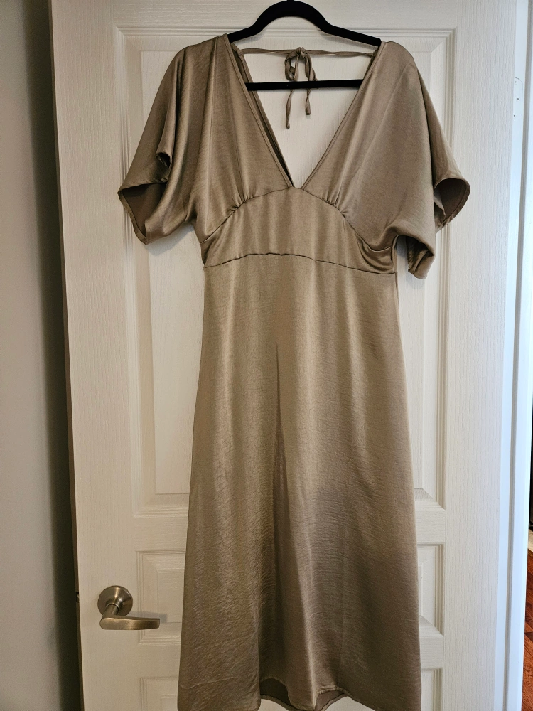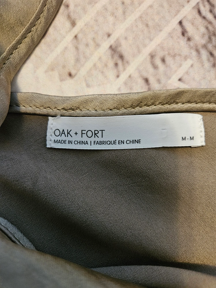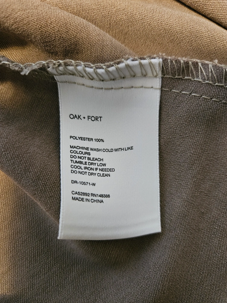 Selling a beautiful Oak + Fort dress in size medium! It's made of 100% polyester and has a lovely drape. The dress features a V-neck and a tie at the back. It's in great condition and ready for a new home