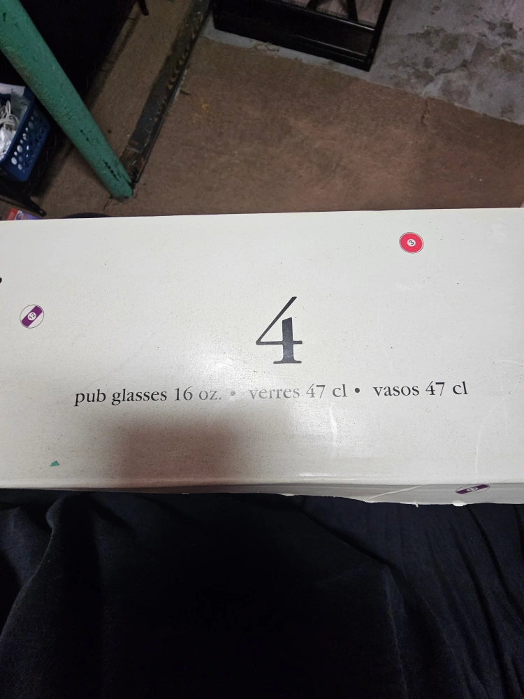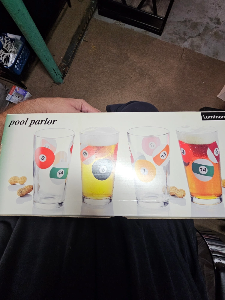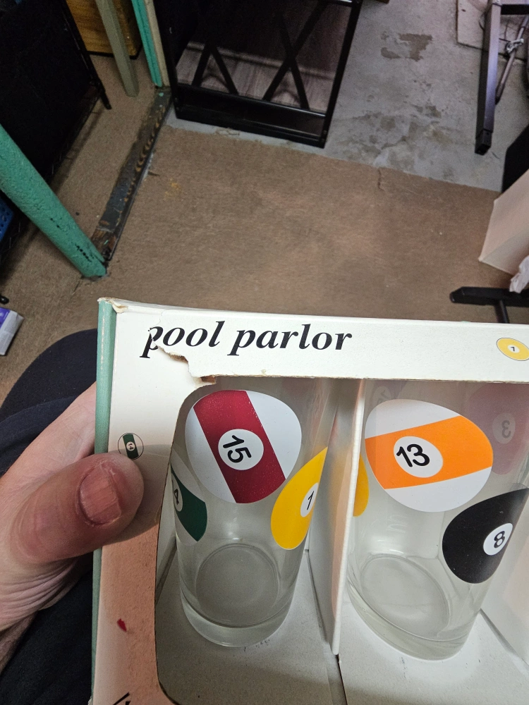 Selling a set of 4 Pool Parlor pub glasses! They each hold 16 oz and feature a fun billiard ball design. Great for adding a touch of whimsy to your home bar or game room