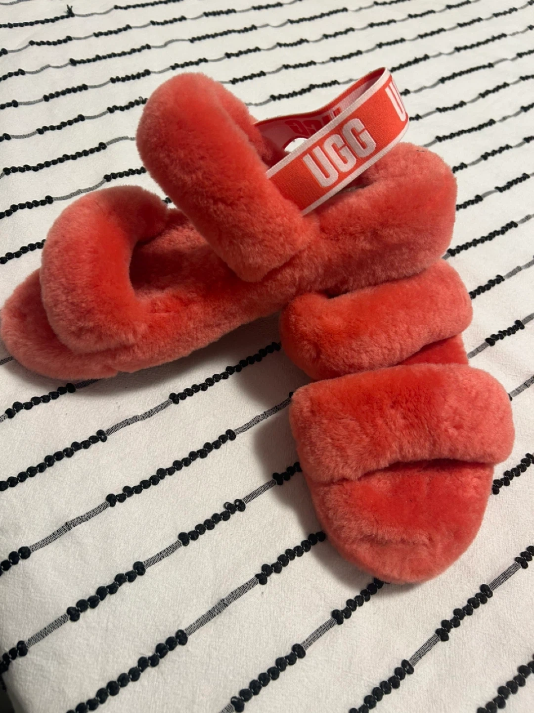 Comfy and stylish UGG Oh Yeah slides in a vibrant coral colour! These are a women's size 10 and are in great condition. Perfect for indoor or outdoor wear, these slides are sure to add a pop of colour to your outfit! I don't have the box or cases. I invite you to view my other items; if you are interested in any of them, I will give you a better price.