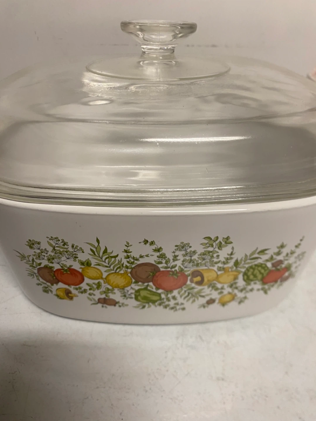 Selling a vintage the Largest Corelle casserole dish complete with its lid! It's in fine shape and features a charming vegetable pattern around the sides. Perfect for baking or serving up your favorite dishes or displaying it as the large vintage fine art it is !